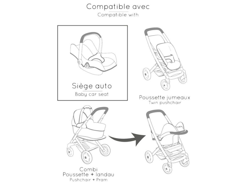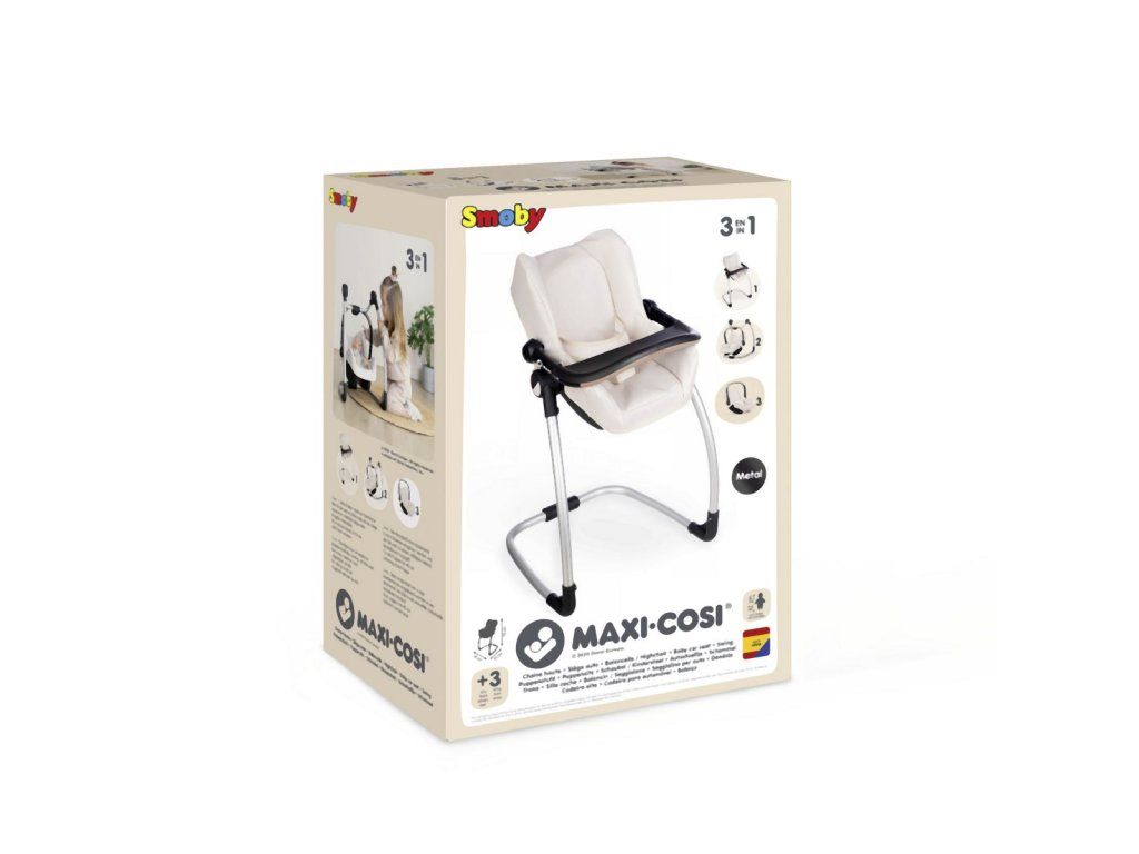 Autosedačka Maxi-Cosi 3 v 1 pre bábiky. Pri zavesení sedačky na konštrukciu je razom hojdačka pre bábiku do veľkosti 42 cm. Otočením konštrukcie získate vysokú jedálenskú stoličku s pultíkom. Rozmery (DxŠxV): 43 x 41 x 72 cm.Dodatočné parametre