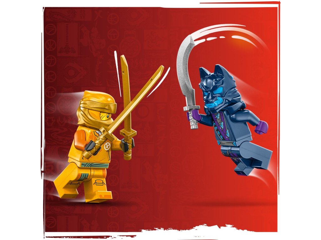Ninžovská hračka Arinov bojový robot (71804) pomôže deťom od 4 rokov zlepšiť svoje staviteľské zručnosti a zároveň sa zapojiť do pokusu nindža hrdinov zachrániť svojich dračích priateľov. Deti sa takisto môžu zahrať na postavy a model obsahuje aj pôsobivú figúrku robota, ktorá deti inšpiruje k vymýšľaniu vzrušujúcich dobrodružstiev z 2. série televízneho seriálu NINJAGO® Dragons Rising. Táto stavebnica LEGO® obsahuje 2 minifigúrky: Arina s prvkom katany a Bojovníka vo vlčej maske s prvkom meča. Arin sa zmestí do figúrky polohovateľného robota, ktorý má v ruke veľký meč a rotujúcu čepeľ, zatiaľ čo Bojovník vo vlčej maske môže lietať vo vznášadle s polohovateľnými krídlami, vystreľovačom diskov a 2 oštepmi. K dispozícii je aj kryštálová jaskyňa z kociek s paličkou roztrieštenia vo vnútri a stojan na zbrane s 2 zlatými prvkami mečov katana. Táto nindžovská hračka poskytne deťom od 4 rokov, ktoré práve objavujú radosť zo stavania z kociek LEGO zábavný zážitok. Model sa dodáva aj so štartovacou kockou; čiastočne zostavenou podložkou, vďaka ktorej sa deti môžu s istotou pustiť rovno do stavania.Dodatočné parametre