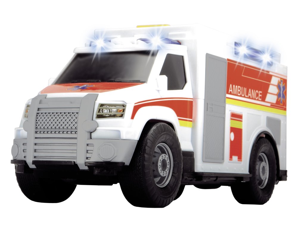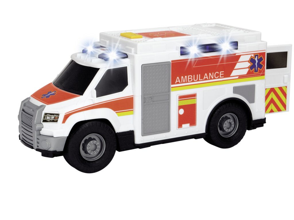 Auto ambulancie na voľnobeh. Svetelné a zvukové efekty. Otváracie zadné dvere. Súčasťou sú aj nosidlá. Dĺžka 30 cm.Dodatočné parametre