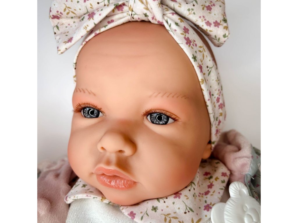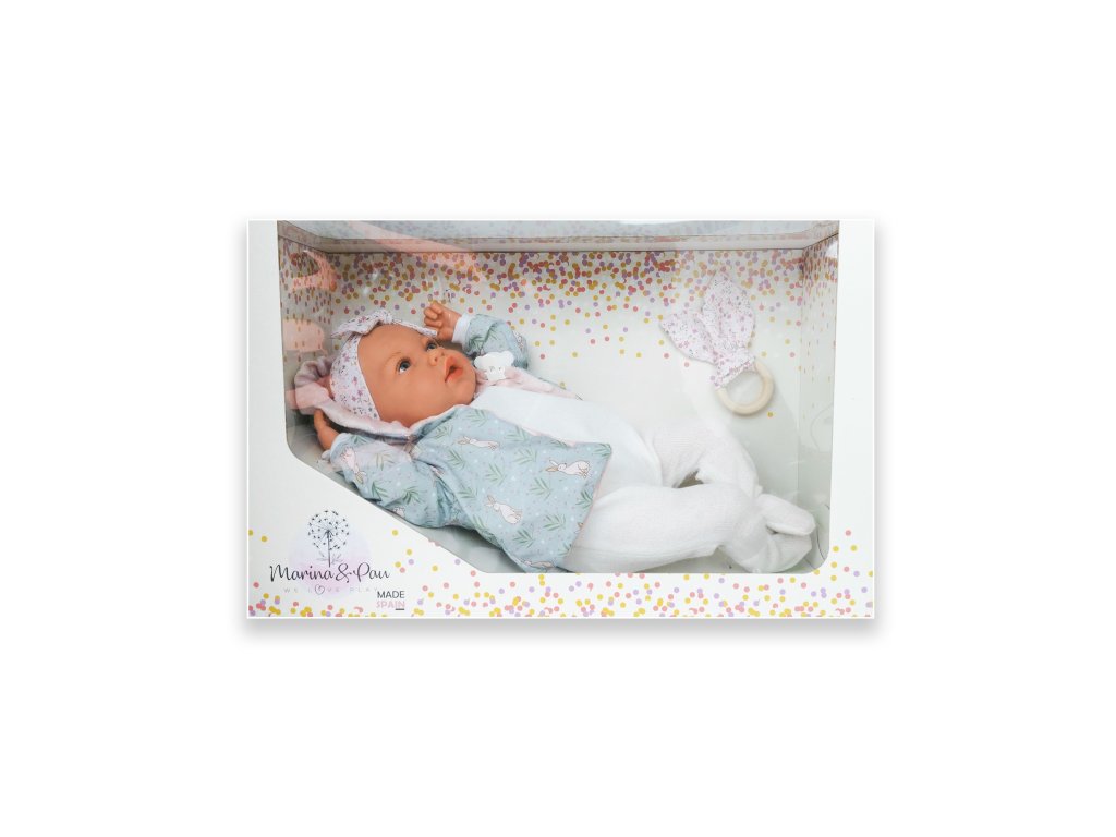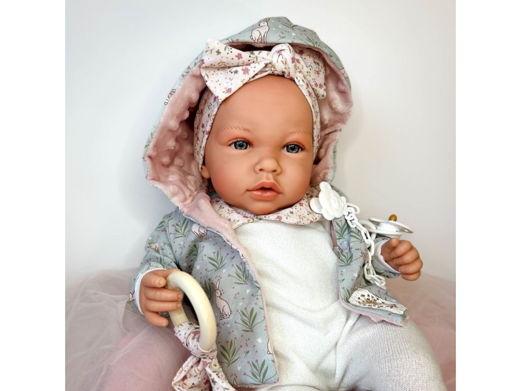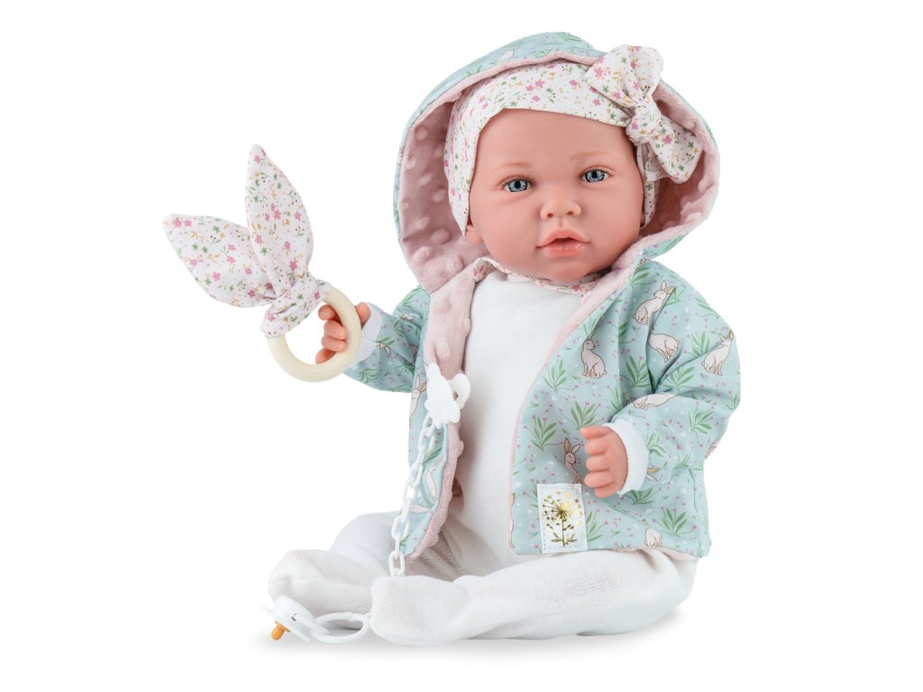 Bábätko je oblečené v bielych dupačkách. Outfit zdobí kvetinový golier. Súpravu oblečenia je možné použiť ako pyžamo na spanie. Štýl dotvorí čelenka s mašľou. Ešte viac možností hrania poskytuje pribalená hračka a cumlík na retiazke s príveskom medvedíka, ktorý sa dá bábike pripnúť na oblečenie, aby bola stále pri sebe. Spolu s bábikou dostanete očarujúcu bundičku s kapucňou. Vnútro bundy je podšité jemným fleecovým materiálom, zvonku ju zdobí grafika zajačika. Bunda sa vám bude hodiť najmä v chladnejších dňoch pri prechádzkach s bábikou.