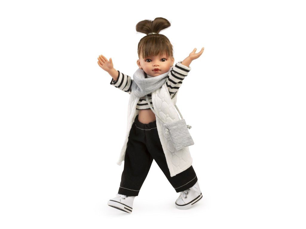 Emily má na sebe čierne látkové nohavice a biely sveter s čiernymi pruhmi. Styling dotvorí biela dlhšia vesta s vyšívaným vzorom, sivá pletená šatka a športová obuv. K štýlovému šatníku bábiky by určite patrila sivá taška cez rameno, ktorá by ladila s jej outfitom. Odteraz je Emily pripravená na akýkoľvek výlet.
