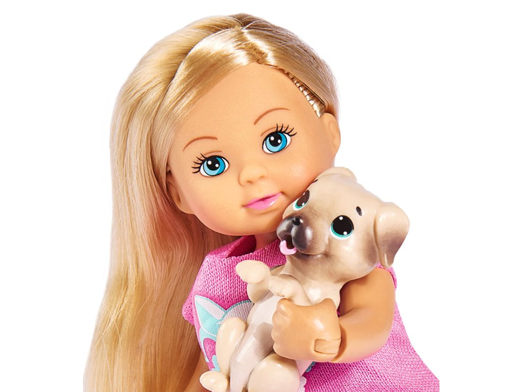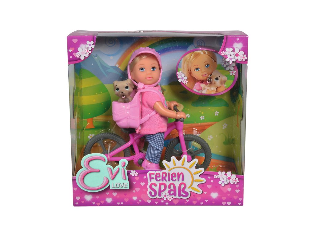 Bábika Evička v cyklistickej prilbe s bicyklom a s jej psíkom sediacim v batohu. Výška bábiky 12 cm.Dodatočné parametre