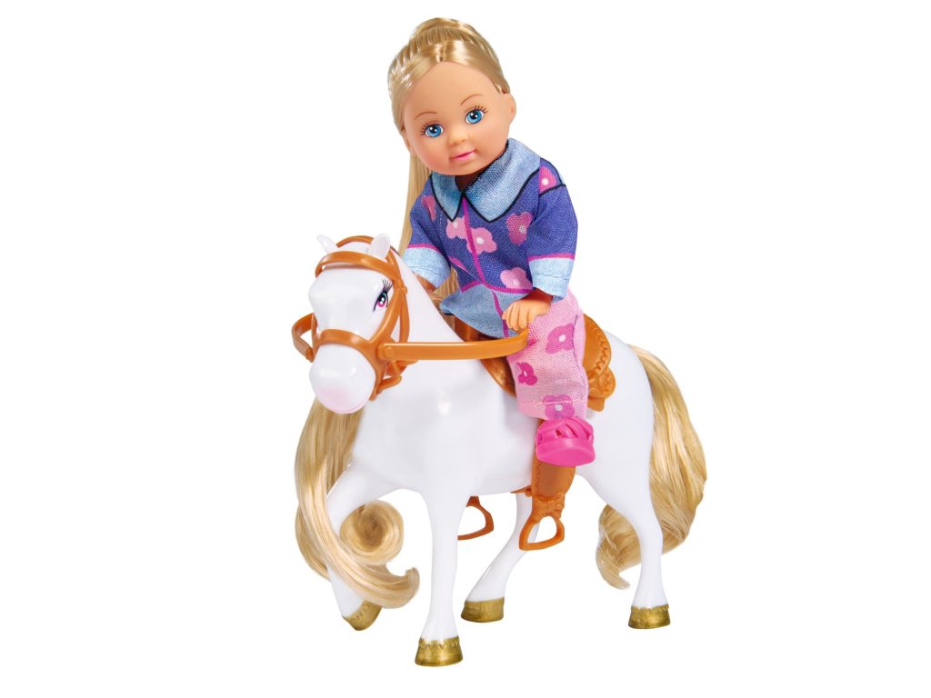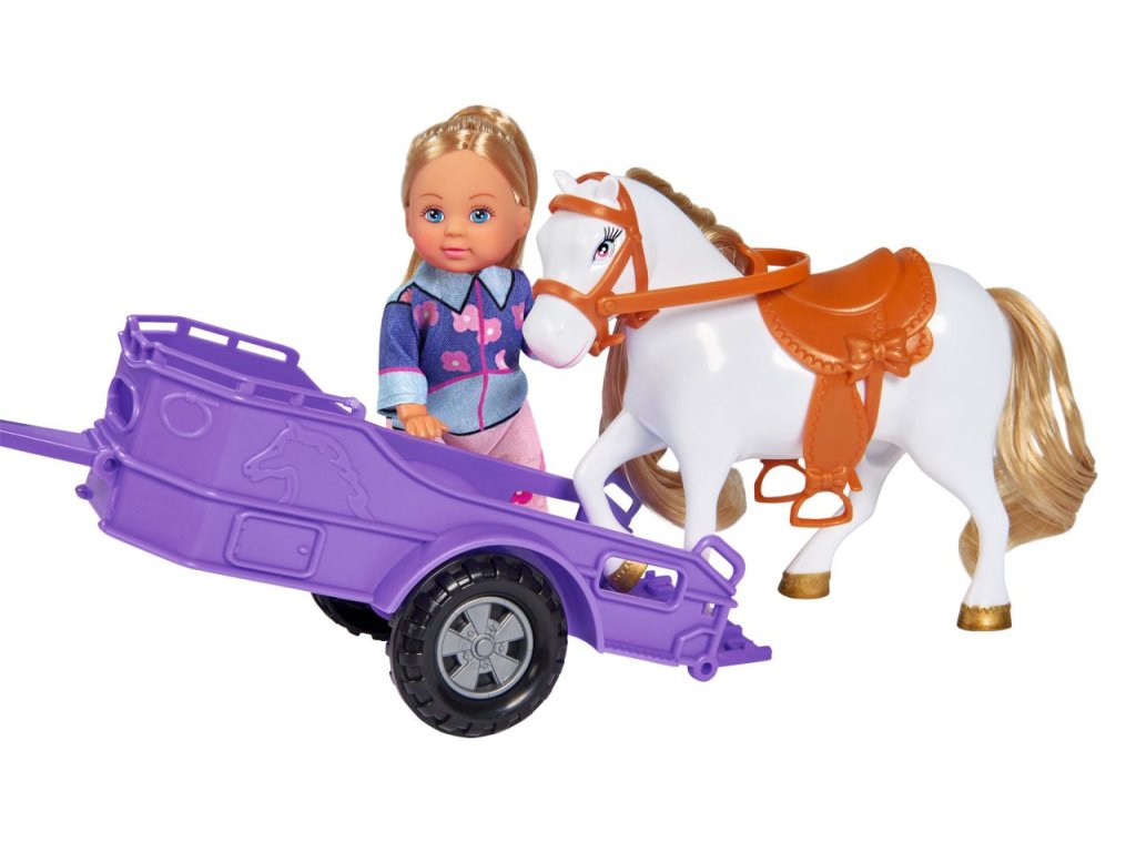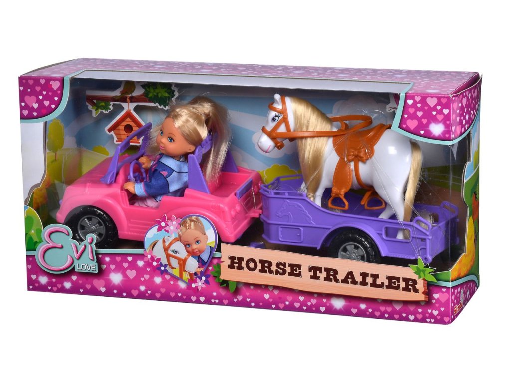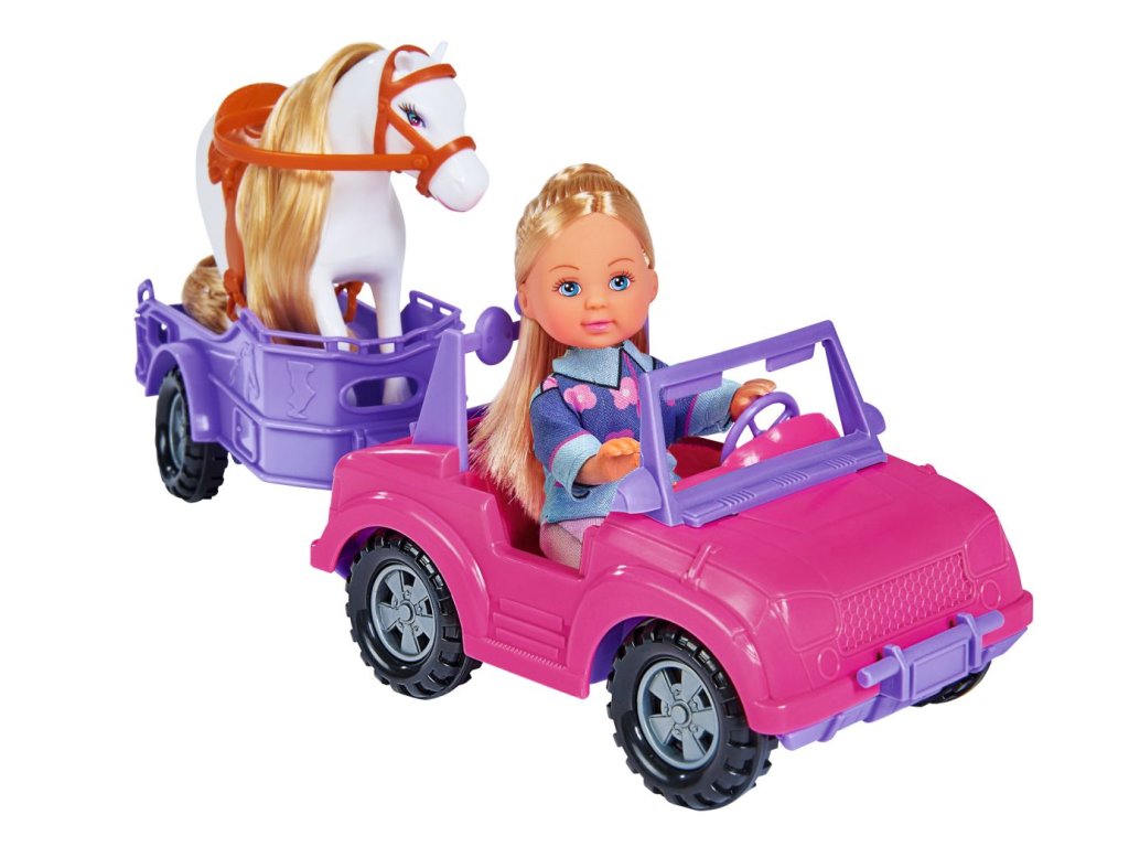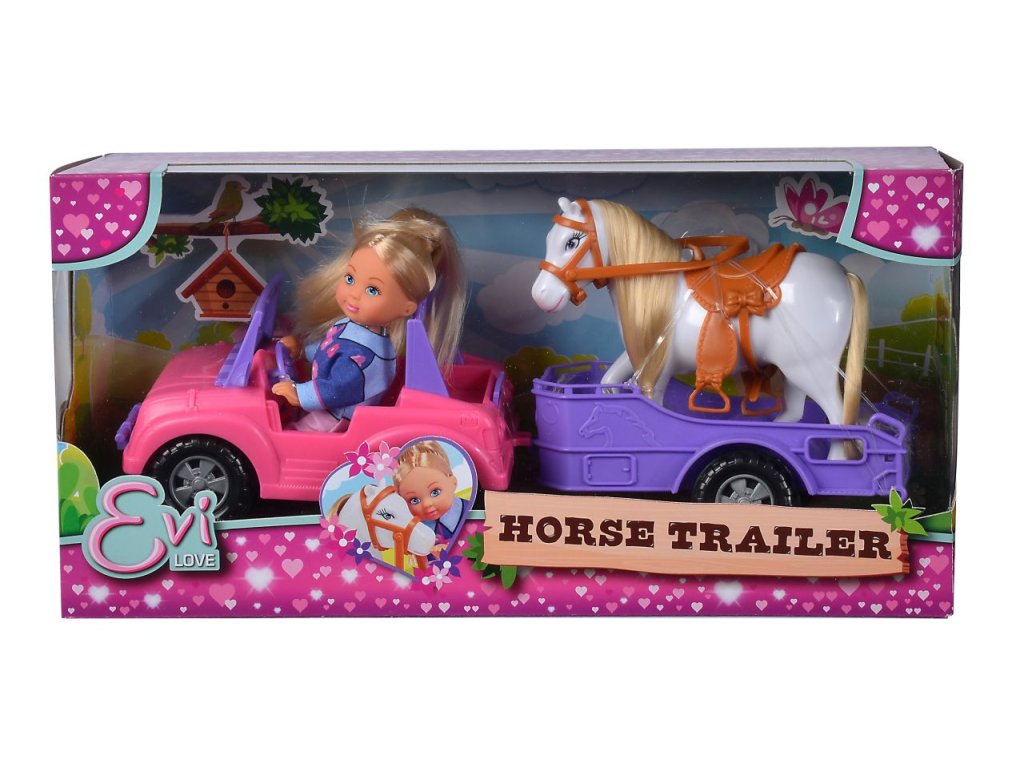 Bábika Evička má džíp a tiež príves pre kone. Nechýba ani poník. Dĺžka auta s prívesom 33 cm. Výška bábiky 12 cm.Dodatočné parametre