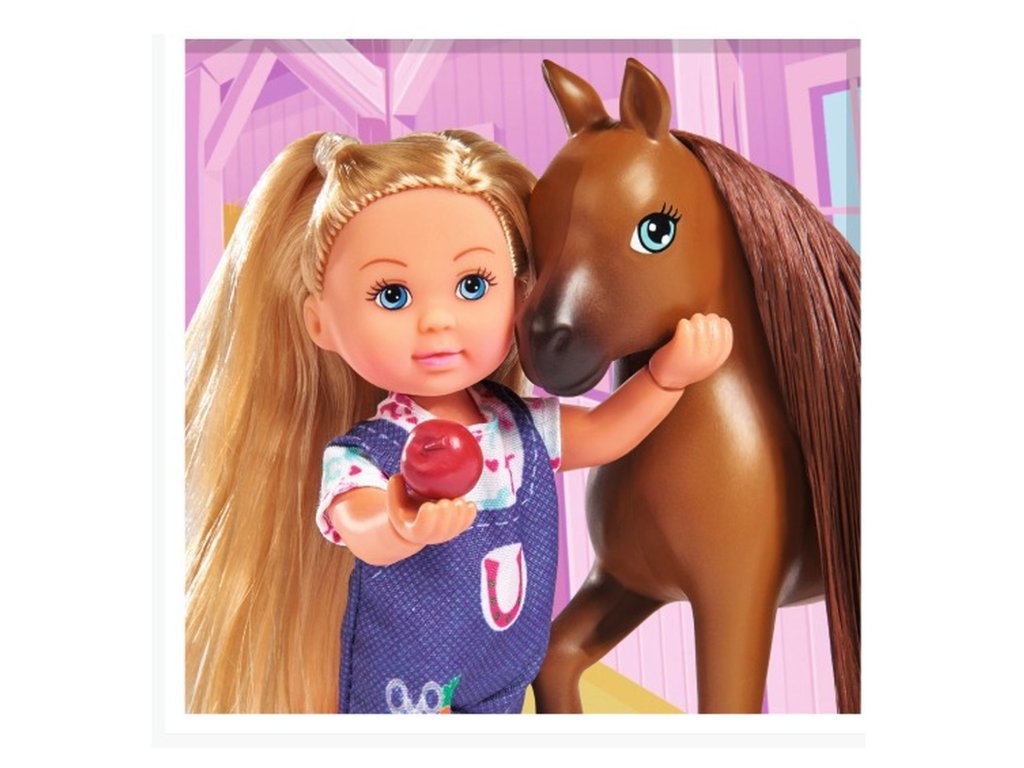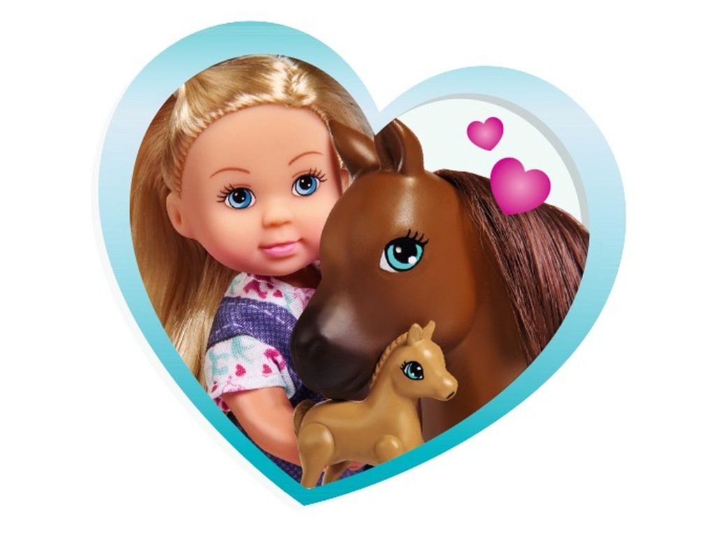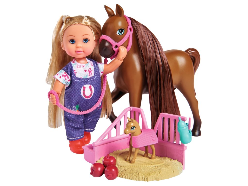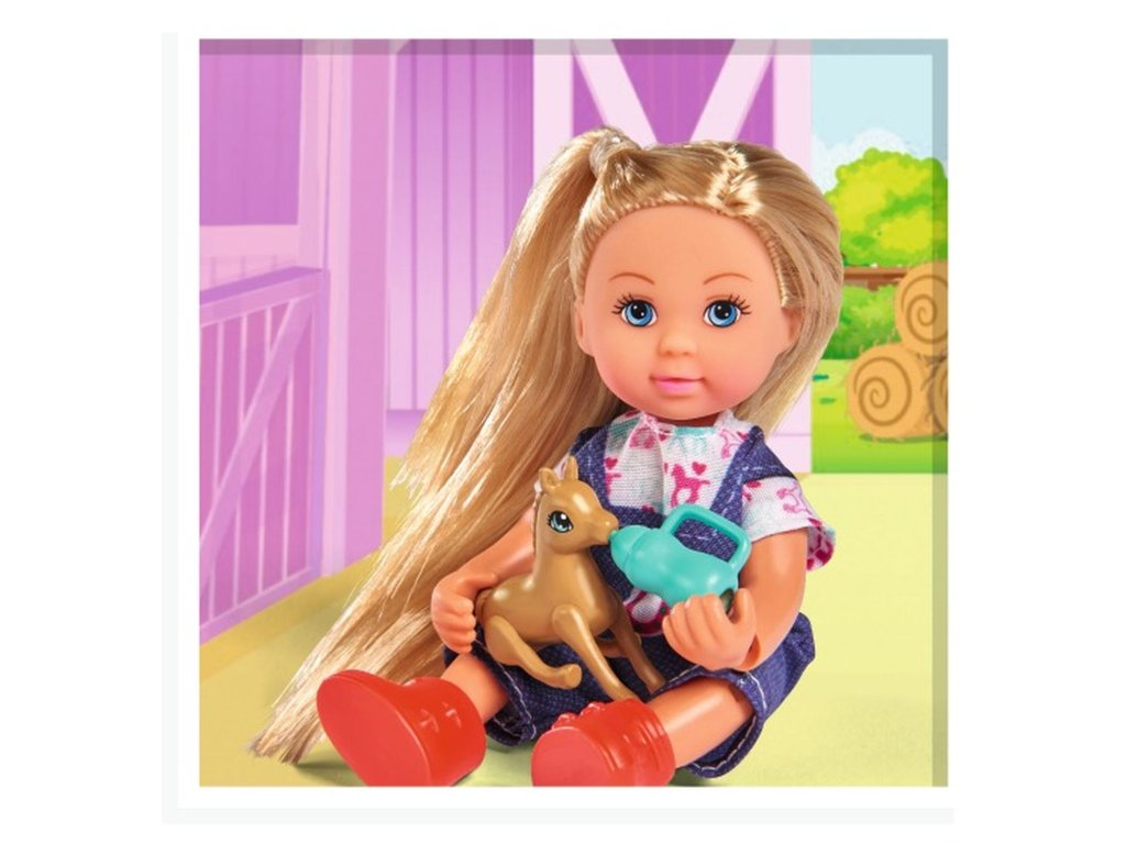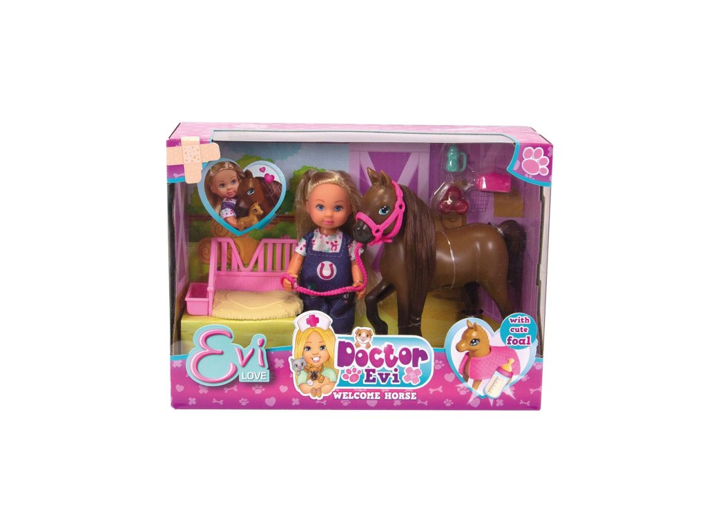 Bábika Evička Veterinárka pomáha na svet žriebätku. S kobylou, žriebätkom, pelechom pre žriebätko a príslušenstvom. Veľkosť bábiky je 12 cm.Dodatočné parametre