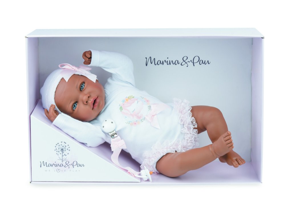 Krásna bábika menom Gala je jedinečné, 45 cm vysoké bábätko z kolekcie exkluzívnych španielskych bábik renomovanej značky Marina & Pau. Má veľké modré oči, ktoré vyzerajú ako skutočné, zvýrazňujú ich husté mihalnice a jemný obrys ručne maľovaného obočia. Model 1232 sa vyznačuje precízne tvarovanými vlasmi. Mäkké bruško robí bábiku skvelou na maznanie. Ďalšou nepochybnou výhodou je kvalitný, ručne šitý outfit v typickom dievčenskom prevedení. Hračku odporúčame deťom od 3 rokov.