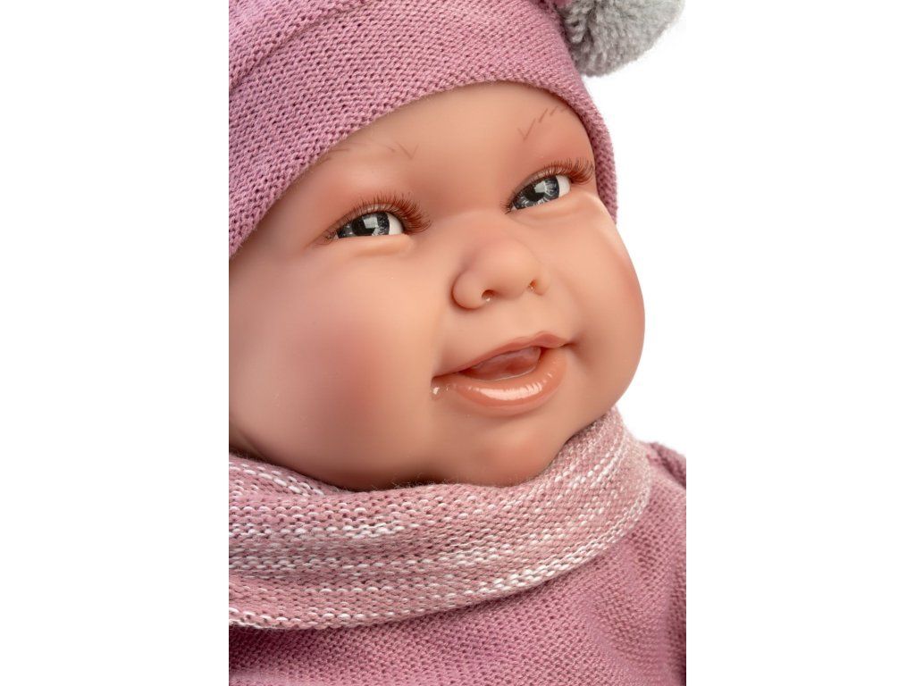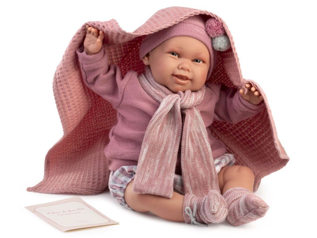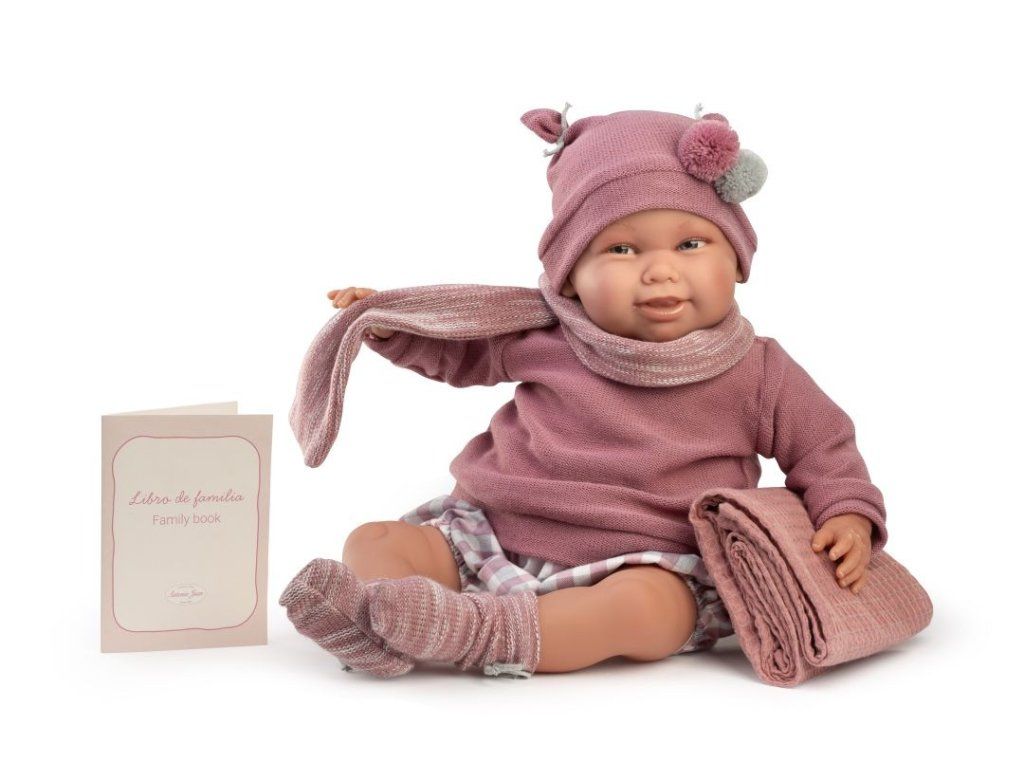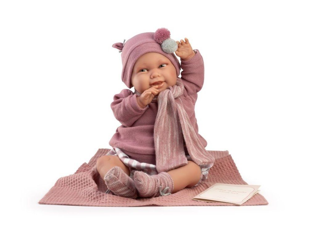 Bábika Spanish Reborn Martina 81387 má kvalitné, štýlové, ručne šité oblečenie a atraktívne doplnky v púdrovo ružovej farbe: teplý svetrík zapínaný vzadu na suchý zips, krátke nohavičky s gumičkou v módnom károvanom vzore, ponožky zdobené roztomilými mašličkami, čiapočku zdobenú nadýchanými brmbolcami, prešívanú deku a plienku.