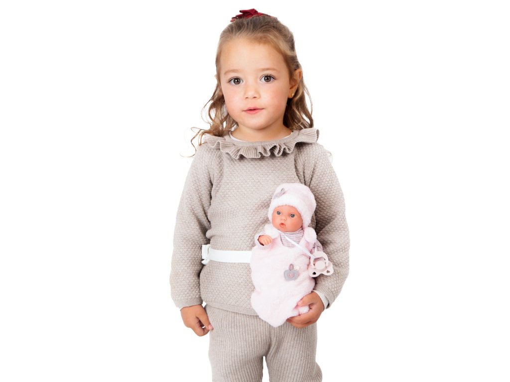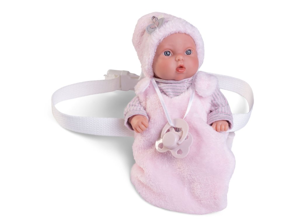 Španielska bábika Antonio Juan 85316 má pohyblivé ruky, nohy a hlavu, takže ju môžete umiestniť do rôznych polôh. Starostlivo vybrané, ručne ušité, odnímateľné oblečenie prispieva k zábave: bavlnený pruhovaný overal s dlhými rukávmi a teplá čiapočka s aplikáciou jabĺčka. Vďaka plyšovému, ružovému batôžku na suchý zips môžete vziať bábätko všade so sebou . Nastaviteľný popruh umožňuje prispôsobiť tašku tvaru tela vášho dieťaťa. Cumlík na stuhe zase umožňuje vášmu dieťatku prevziať úlohu starostlivej mamičky.