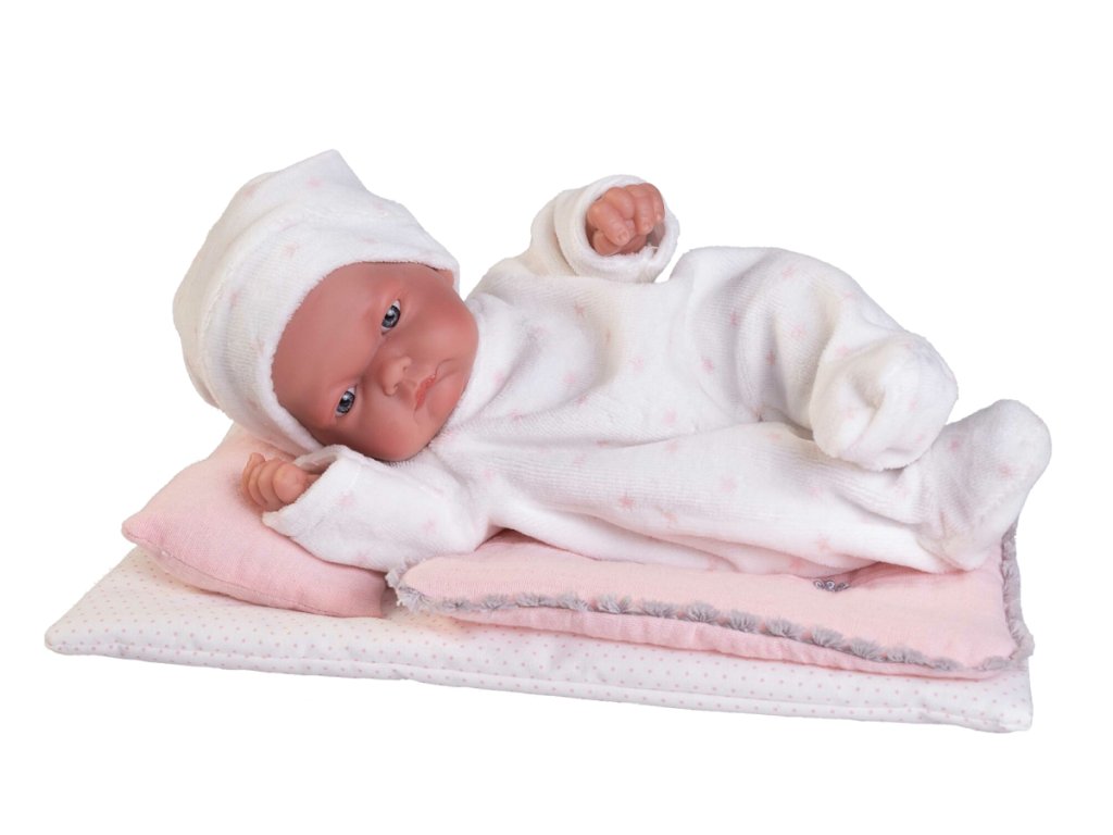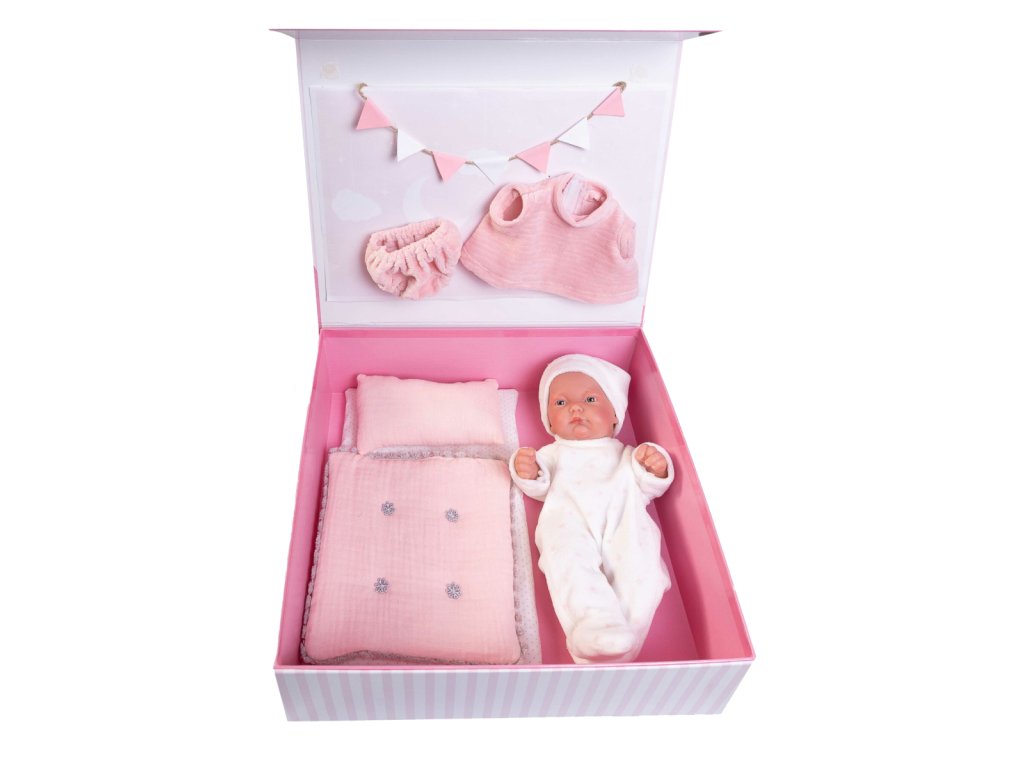 Španielska bábika Pitu s obliečkami a oblečením Antonio Juan 84094. Rozkošné bábätko s postieľkou s názvom Pitu 84094 je model z najnovšej kolekcie 2023 od španielskej značky Antonio Juan. Bábika je vysoká 26 cm a váži 410 g. Klobúk s hviezdnou potlačou zvýrazňuje jej očarujúce črty tváre. Výrobok je určený na hranie pre deti staršie ako 2 roky.