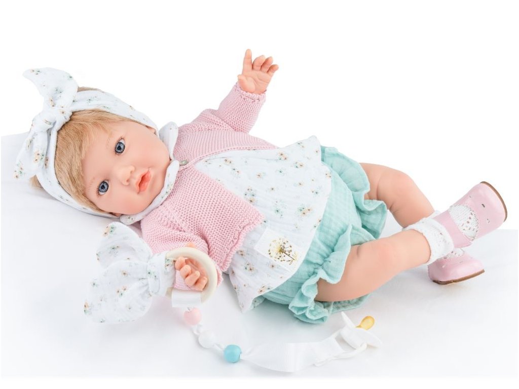 Vinylová bábika Spanish Reborn s mäkkým bruškom pripomína vzhľadom a váhou skutočné bábätko. Alina je vysoká 45 cm a má veľké modré oči s hustými mihalnicami. Malé ruky so štíhlymi prstami, manikúra, pedikúra, jemne ružová pokožka, maľované obočie dodávajú realistický vzhľad. Dievčatko má krátke svetlé vlasy, zdobené čelenkou zviazanou do mašle. Všetky detaily sú ručne vyrobené, vďaka čomu je bábika jedinečná.