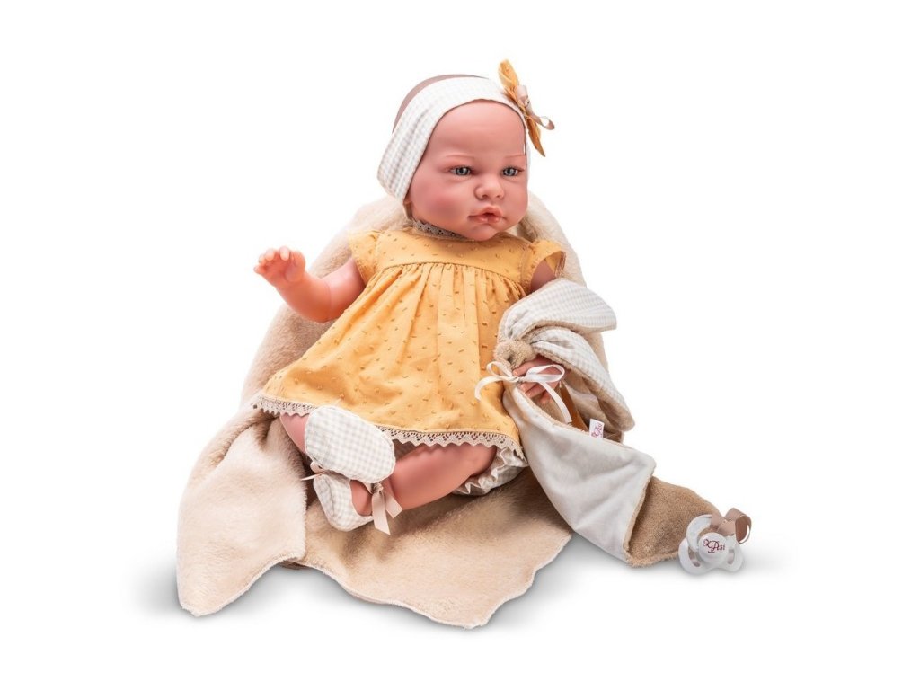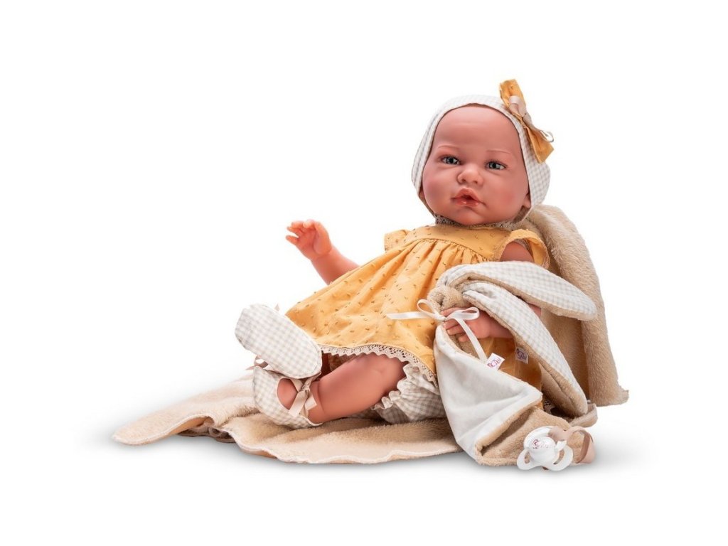 Bábika Spanish Reborn ASI0477490 má kvalitné, štýlové, ručne šité oblečenie a atraktívne doplnky v jemných farbách: