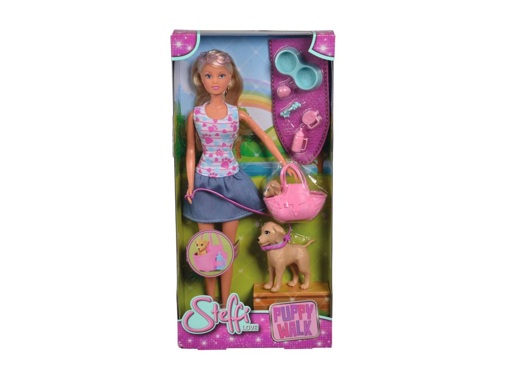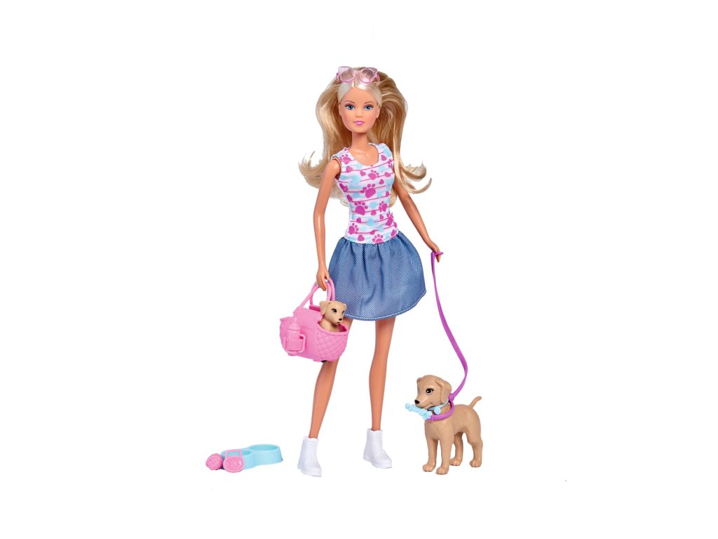 Bábika Steffi na prechádzke so psíkom a šteniatkom, vrátane tašky a príslušenstva, 10 ks. Výška bábiky 29 cm.Dodatočné parametre