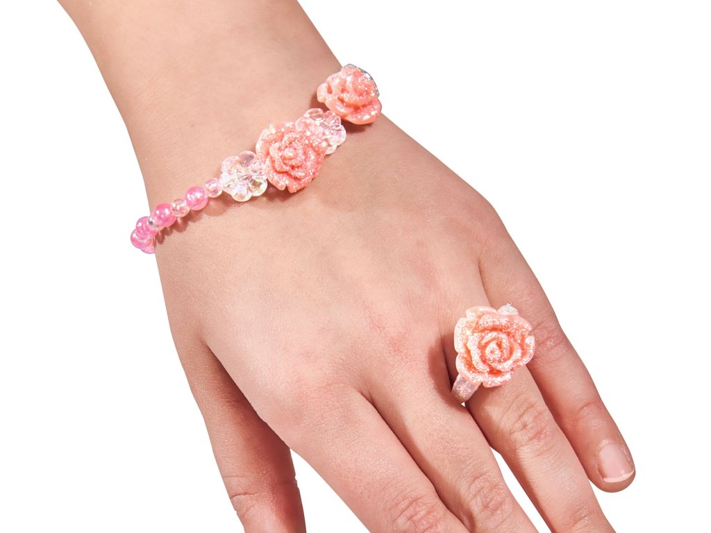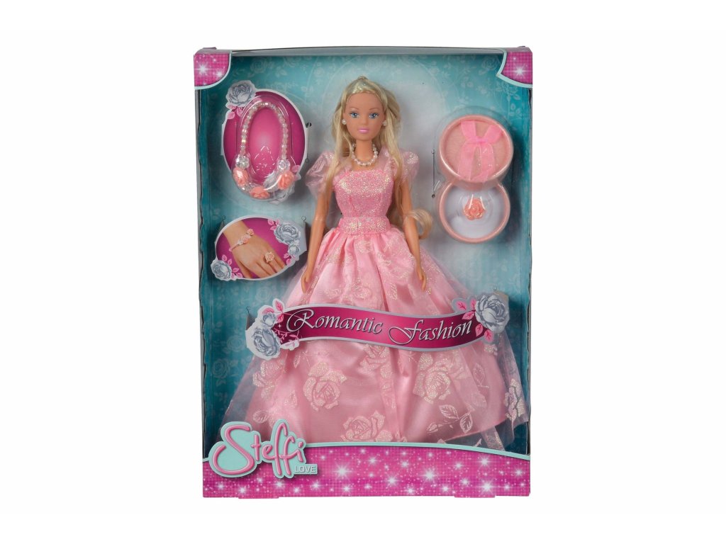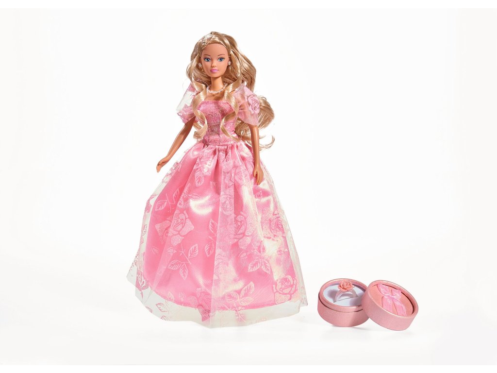 Steffi v romantických ružových šatoch, s prstienkom a náramok pre dievčatko. Súčasťou je darčeková škatuľka na prstienok. Veľkosť bábiky 29 cm.