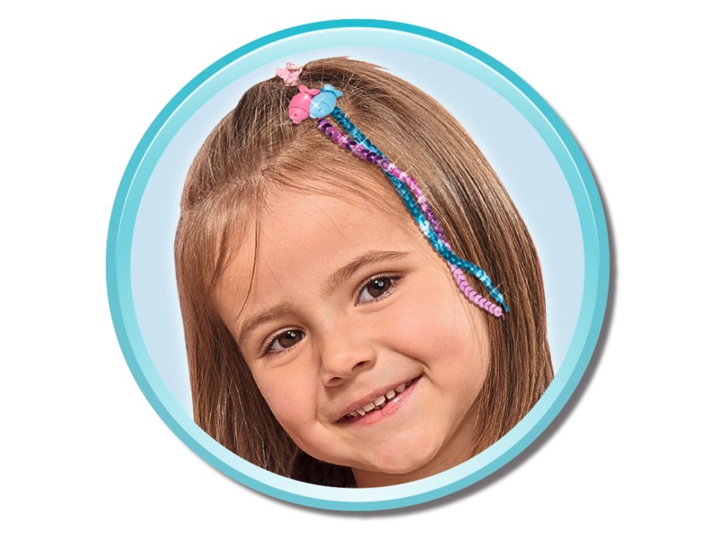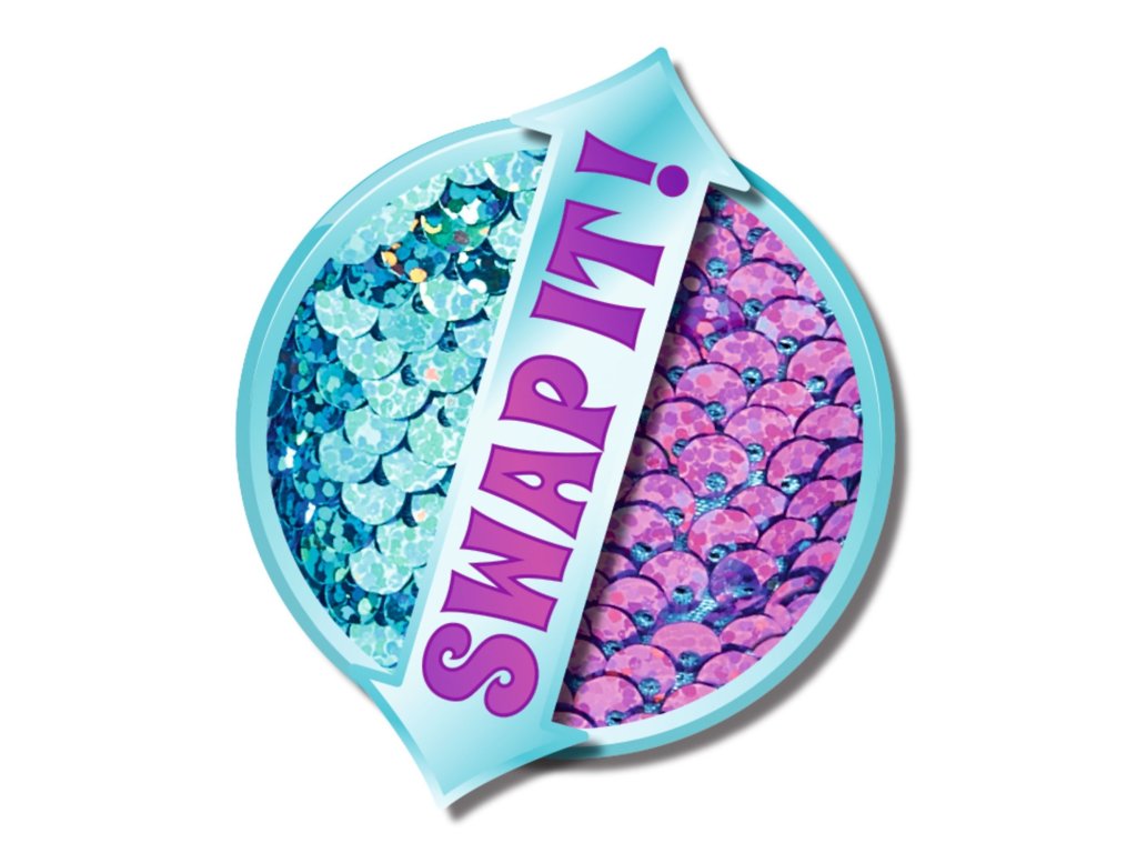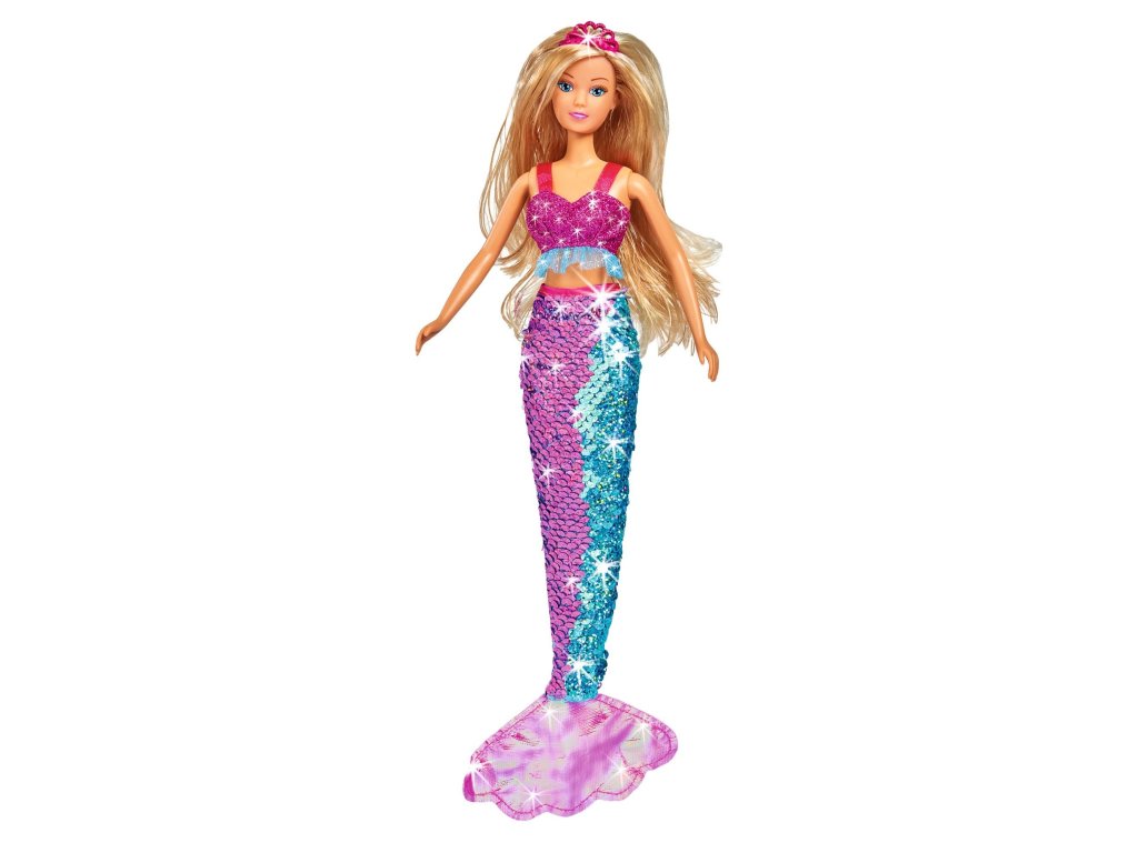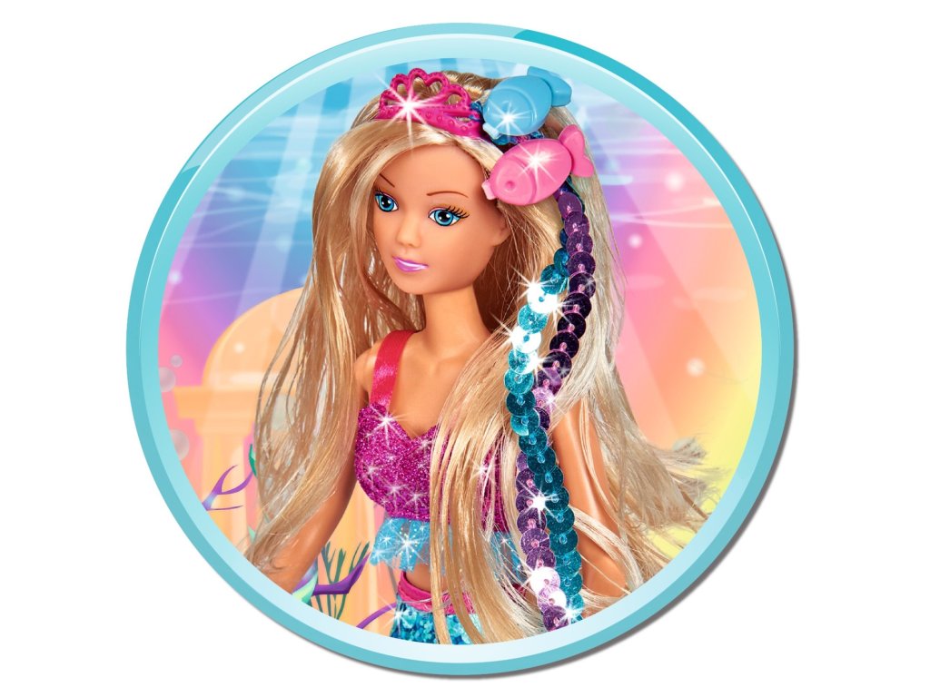 Bábika Steffi ako morská panna s dvomi pripínacími vlasovými prameňmi a s plutvou z farebných flitrov so swap efektom. Veľkosť 29 cm.Dodatočné parametre
