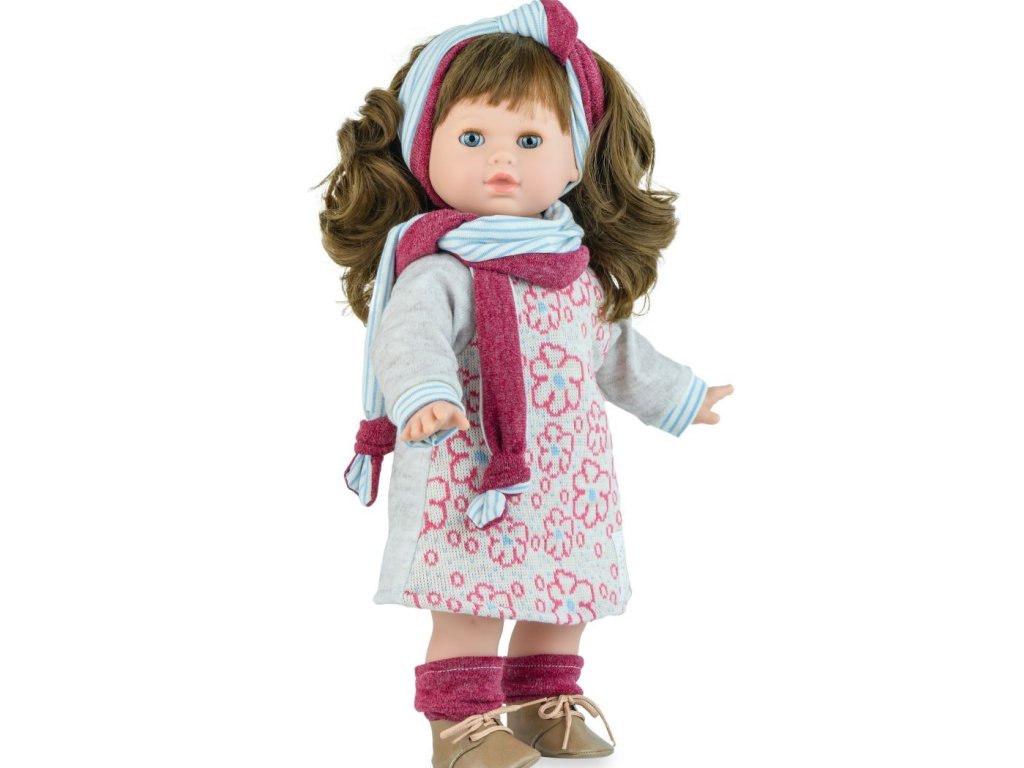 Španielska bábika Tina, ideálna na hranie . Poteší hustými, mäkkými, mierne kučeravými hnedými vláskami zviazanými dvojfarebnou čelenkou a ručne maľovanými modrými očami, s krásnymi hustými mihalnicami a jemne vyrysovaným obočím. Lesklé pery a ružové líca dodávajú tvári veselý výraz.