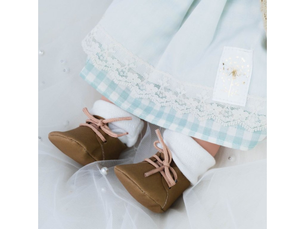 Bábika je oblečená v bielo-mätových kockovaných šatách s krátkymi rukávmi, ktoré sú v páse prestrihnuté. Nafúknuté zakončenie rukávov dodáva tejto kreácii šik a elegantný nádych. Súpravu doplnia biele ponožky a hnedé zaväzovacie topánky . To všetko je navrhnuté tak, aby sa naša malá uličníčka mohla ľahšie obliekať. Štýlový outfit by tiež nebol kompletný bez béžovej kabelky na drobnosti. Všetky tieto doplnky dokonale ladia so zvyškom stylingu. Nechajte svoju dcérku cítiť sa ako skutočná mamička starajúca sa o svoje dieťatko. Dievčatá sa pri hre naučia zodpovednosti.