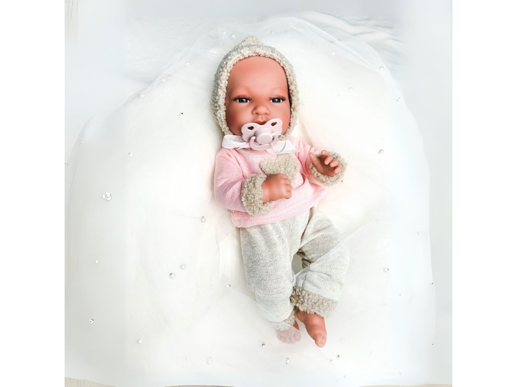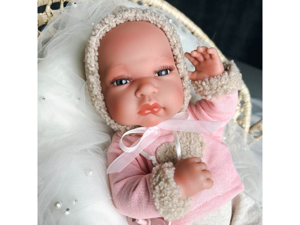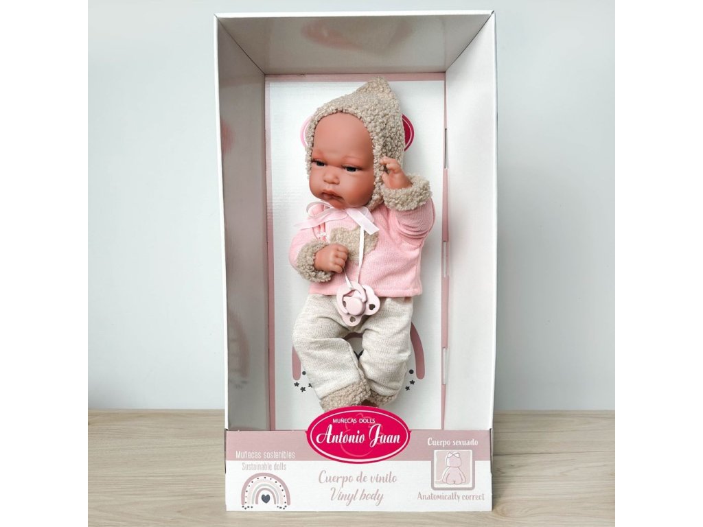 Španielska bábika Antonio Juan 6045. 33-centimetrová bábika je unikátna, limitovaná verzia najpredávanejšieho modelu Baby Toneta. Vyniká zimným outfitom v jemných, ružových a béžových farbách. Jedinečný dizajn renomovanej značky zaujme krásnou, veselou, realisticky pôsobiacou tvárou. Španielska bábika 6045 vyrobená z hladkého kvalitného vinylu sa vyznačuje rafinovanými detailmi, ako sú dlhé mihalnice, ručne maľované obočie, pery a nechty, vytvarované vlasy a záhyby.