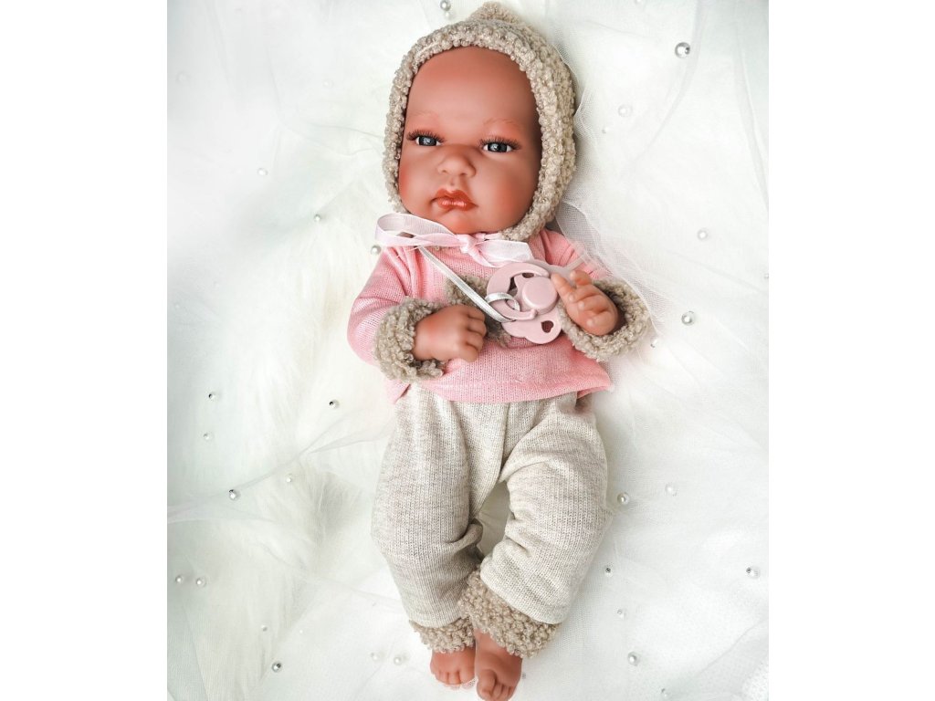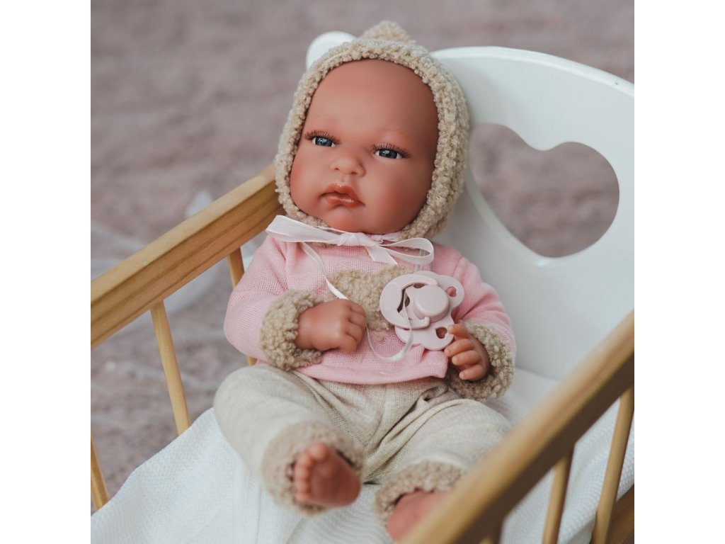 Antonio Juan Baby Toneta 6045 v súprave s luxusným oblečením na chladné dni. Španielska bábika Baby Toneta 6045 v zimnej verzii má pohyblivé ruky, nohy a hlavičku, takže ju môžete dávať do rôznych polôh. Teplý, kvalitný, ručne šitý outfit pridáva na zábave: teplá svetloružová mikina s kapucňou lemovaná nadýchanou béžovou kožušinkou, zdobená aplikáciou v tvare srdca, béžové úpletové nohavice s kožušinovým lemom, cumlík zavesený na saténovej stuhe.