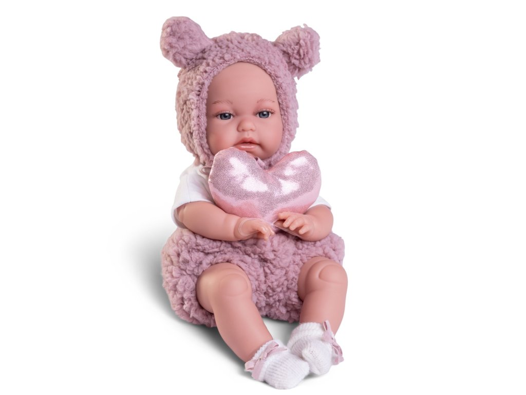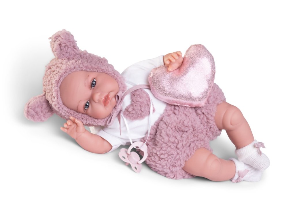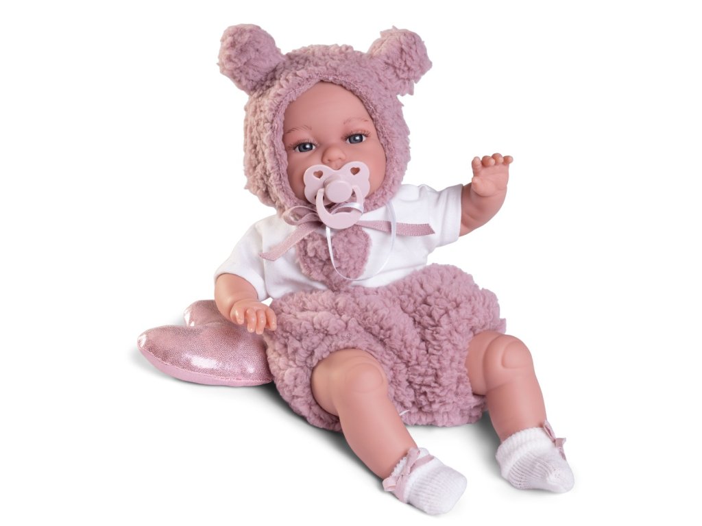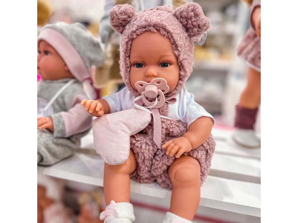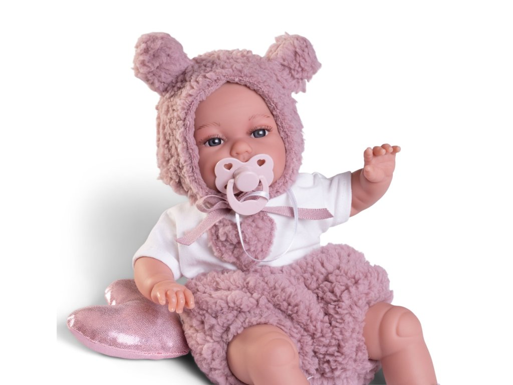 Španielska bábika Baby Toneta v súprave s jedinečným outfitom. Realisticky vyzerajúce bábätko má vytvarované vlásky a jemne namaľované obočie, nechty, odtlačky prstov a záhyby. Baby Toneta od značky Antonio Juan je oblečená v bielej bavlnenej blúzke so zapínaním na suchý zips a plyšovým srdiečkom. Má plyšovo púdrovo-ružové šortky s gumičkou a čiapočku s uškami. Všetky časti oblečenia sa dajú ľahko vyzliecť a bábätko sa dá prezliecť do inej súpravy oblečenia. K bábätku je pribalený aj cumlík na saténovej stuhe.