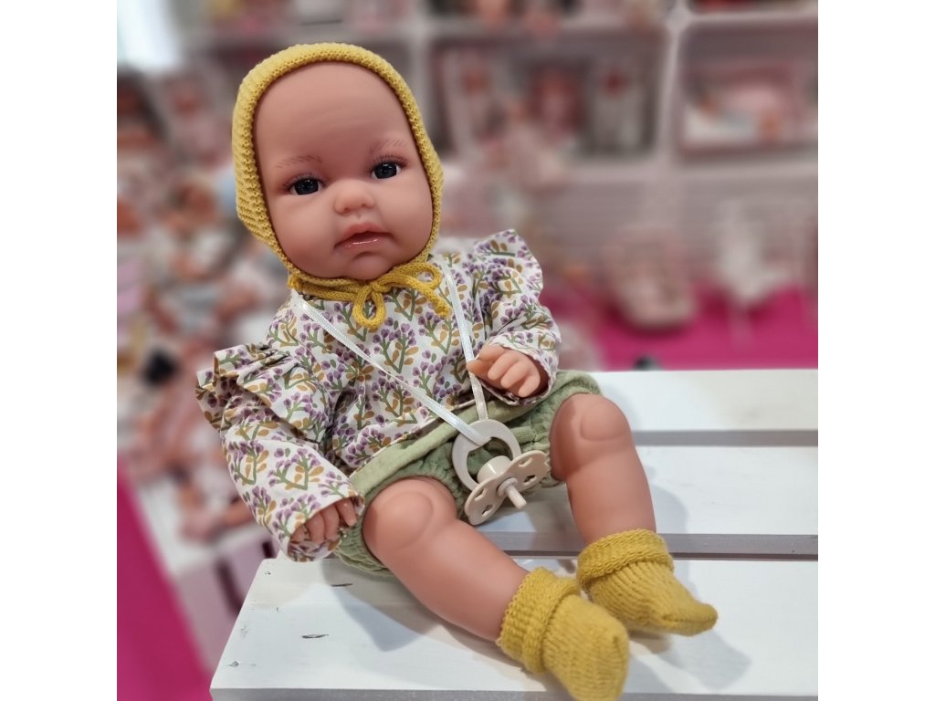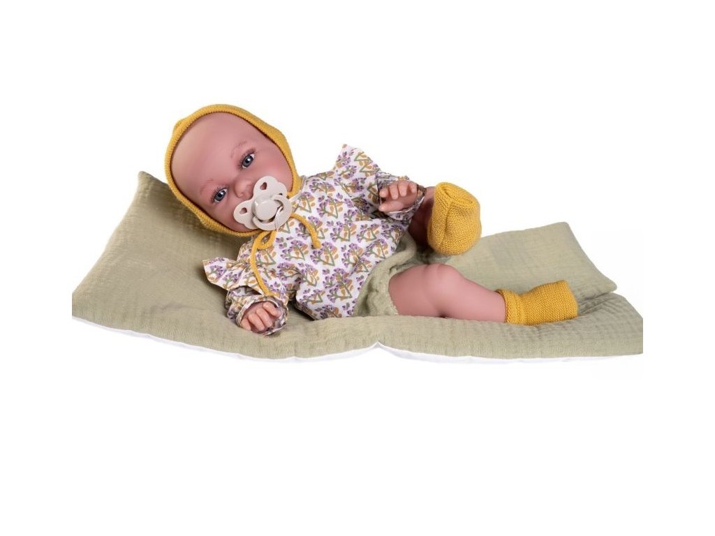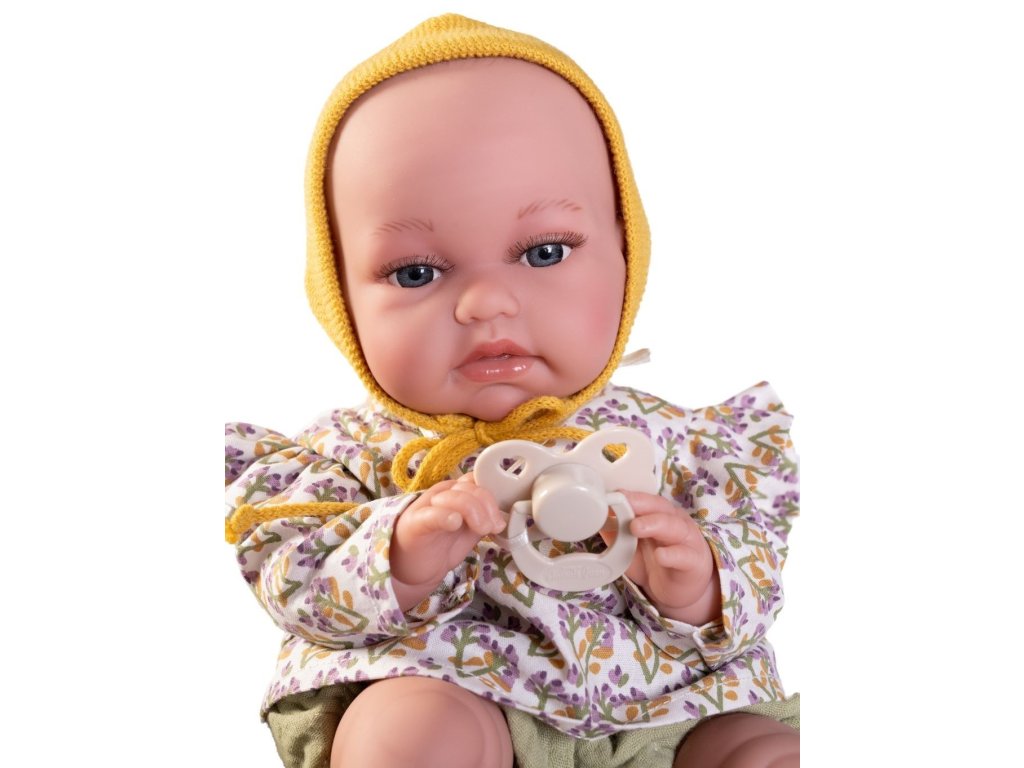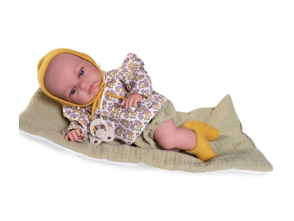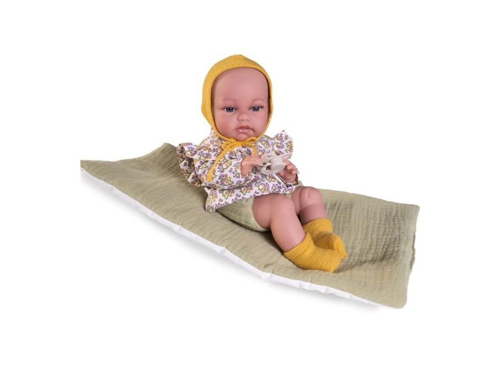 Španielska bábika Toneta s vankúšikom. Realisticky vyzerajúce bábätko má vytvarované vlásky a jemne namaľované obočie, nechty, odtlačky prstov a záhyby. Baby Toneta od značky Antonio Juan je oblečená vo vzorovanej blúzke s volánovými ozdobami, v zelených mušelínových šortkách, zaviazanej čiapočke a ponožkách. Všetky časti oblečenia sa dajú ľahko vyzliecť a bábätko sa dá prezliecť do inej súpravy oblečenia. Súprava obsahuje aj vankúšik a cumlík na saténovej stuhe.