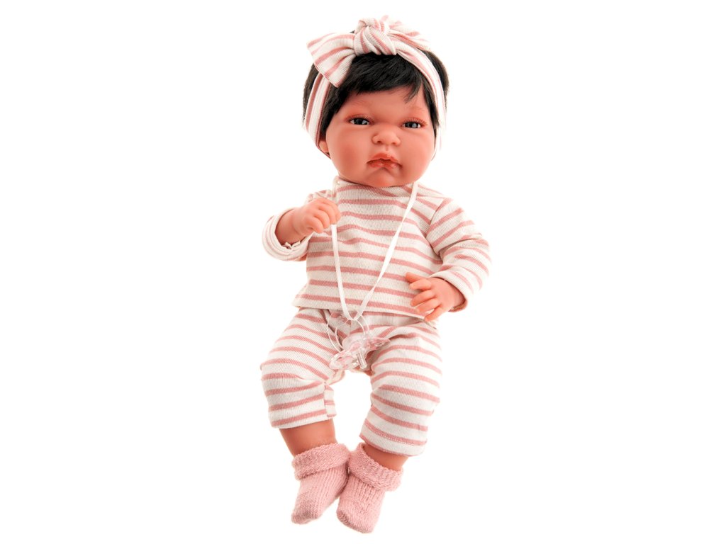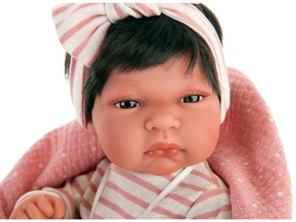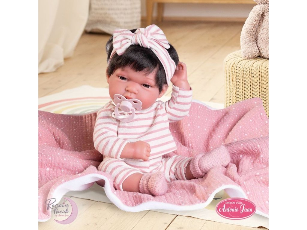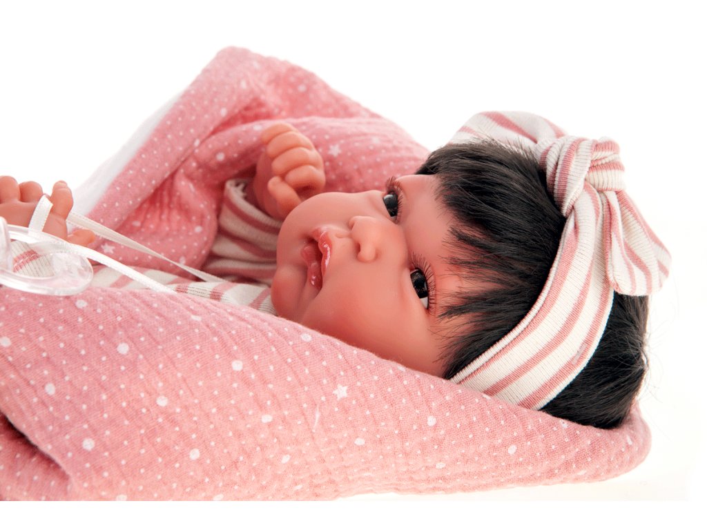 Španielska bábika Toneta s dekou Antonio Juan 60146 Bábika. Toneta 60146 je dievčatko vyrobené podľa skutočného bábätka. Vidno to na presne odrazených jamkách a záhyboch na trupe a končatinách. Rovnako ako na odtlačkoch prstov na nohách a rukách.