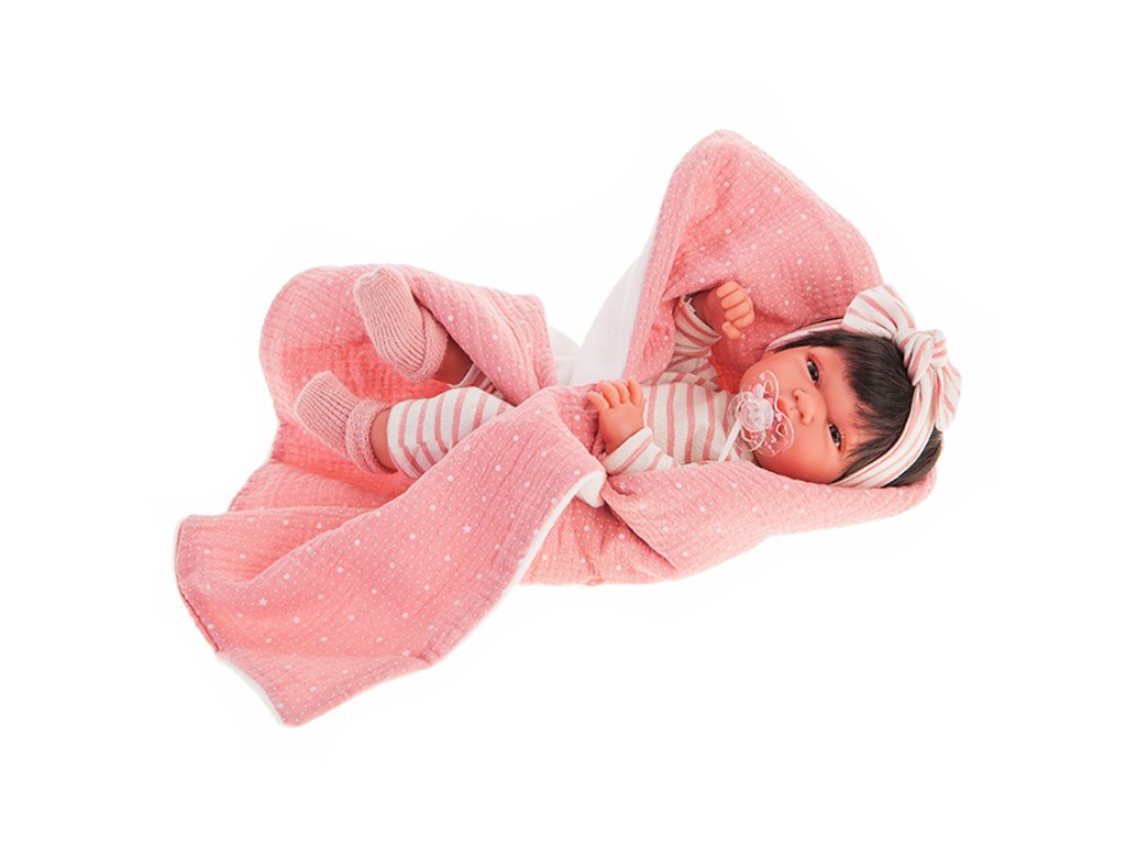 Bábätko má na sebe krásnu, elegantnú súpravu. Dievčatko má oblečenú súpravu so šortkami a blúzkou. Celý odev je biely a zdobený ružovým pásikovým vzorom. Súpravu dopĺňajú teplé ružové ponožky z jemného materiálu príjemného na dotyk. Za zmienku stojí aj prikrývka, nevyhnutný prvok pri prechádzkach, preto sa vám ružová deka bude hodiť ako prikrývka do postieľky či kočíka. Paplón je obojstranný, vonkajšia vrstva je jemná a biela, pričom druhá časť je ružová a zdobená drobným vzorom bodiek a hviezdičiek. Ďalším lákadlom je cumlík pripevnený k bábike, ktorý je zavesený na stuhe. Vďaka prívesku bude mať slečna daný doplnok pri sebe.