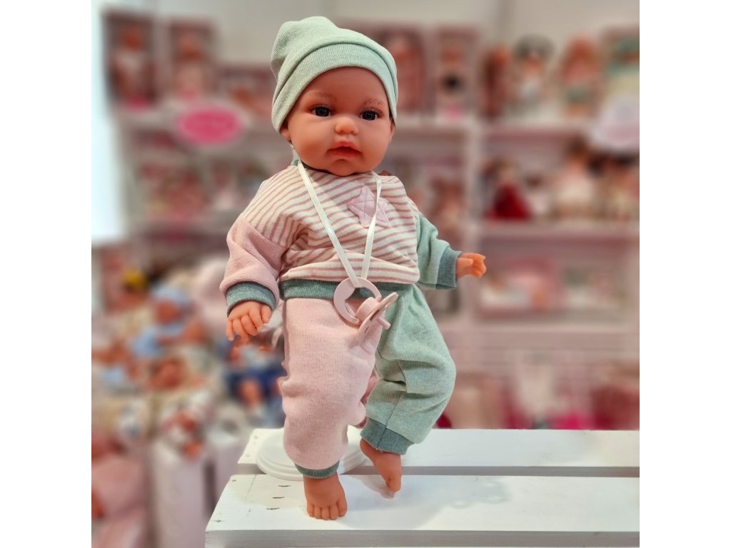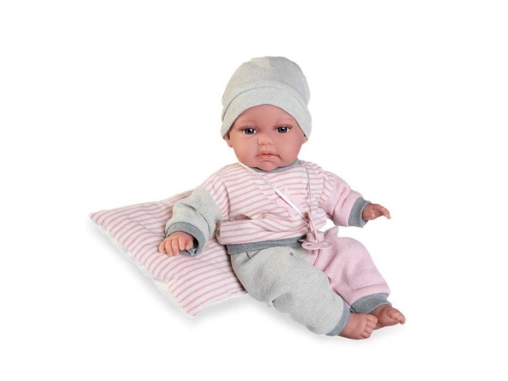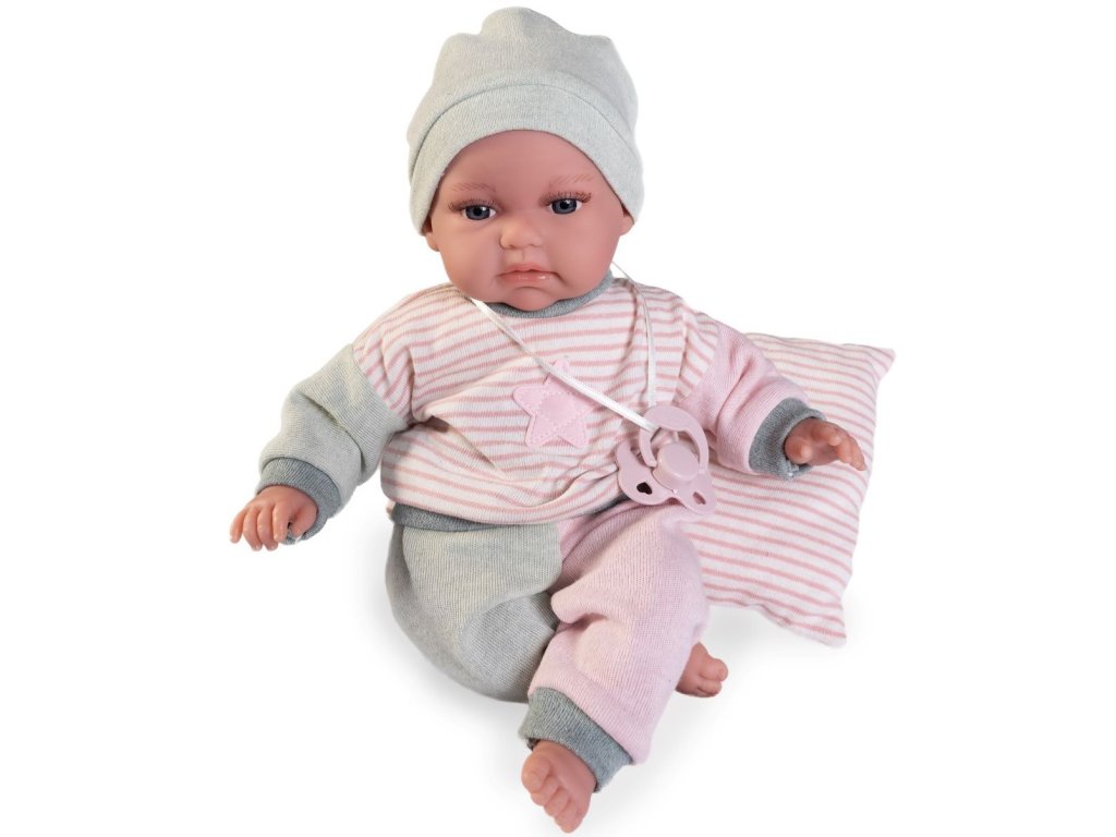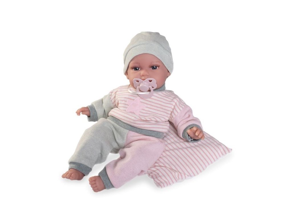 Bábika Spanish Baby Toneta 70331 s doplnkami a ručne šitým oblečením. Toto realisticky vyzerajúce vinylové dievčatko s jemným bruškom má vytvarované vlásky a jemne namaľované obočie, pery, nechty. Toneta od značky Antonio Juan je odetá do jemného, teplého, dvojdielneho pyžama v ružovej a sivej farbe. Outfit je doplnený klobúkom.