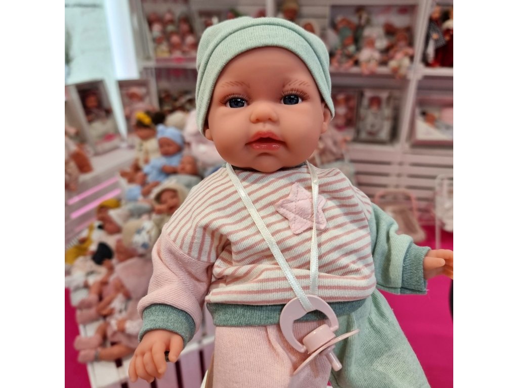 Baby Toneta Antonio Juan 70331 Španielska brblajúca bábika. Interaktívne bábätká sú obľúbené najmä medzi jedinečnými španielskymi bábikami značky Antonio Juan. Toneta 70331 sladko bľabotá, vďaka čomu je pre vaše dieťa atraktívnejšie hrať úlohu starostlivéj mamičky. Rozkošná Tonetina charakteristická veselá tvár a modré oči s krásnymi dlhými mihalnicami. 34-centimetrová španielska bábika, má hlavu a pohyblivé končatiny vyrobené z mäkkého, na dotyk príjemného vinylu. Vďaka mäkkému brušku je ako stvorená na maznanie. Boal navrhnutá pre deti od 3 rokov.