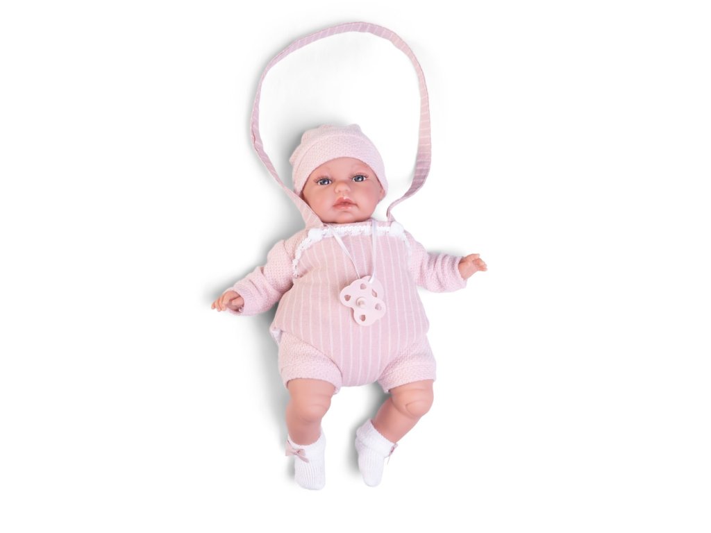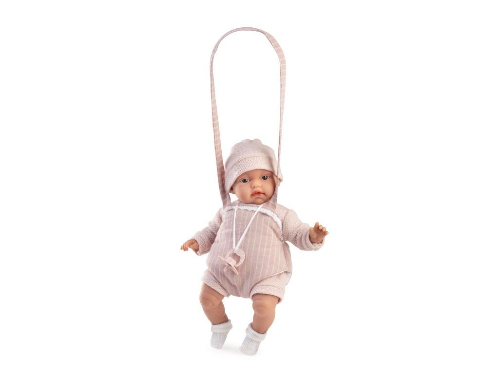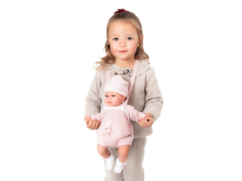 Bábika Toneta v nosiči Antonio Juan 70357. Kolekcia renomovanej značky Antonio Juan obsahuje okrem vinylových bábätiek aj tie najkvalitnejšie, jedinečné španielske funkčné bábiky. Baby Toneta 70357 je ďalšie dievčatko, ktoré má špeciálny zvukový mechanizmus. Keď mu stlačíte mäkké bruško, sladko bľabotá. Zvukový mechanizmus sa automaticky vypne po približne 30 sekundách alebo pri použití magnetického cumlíka.