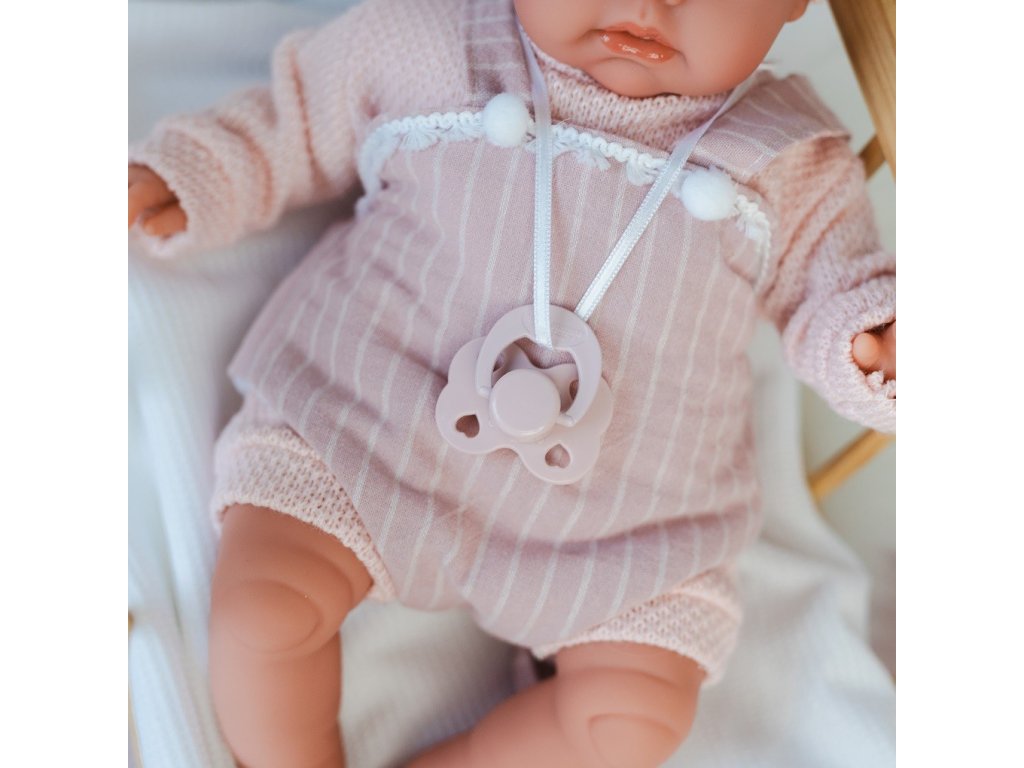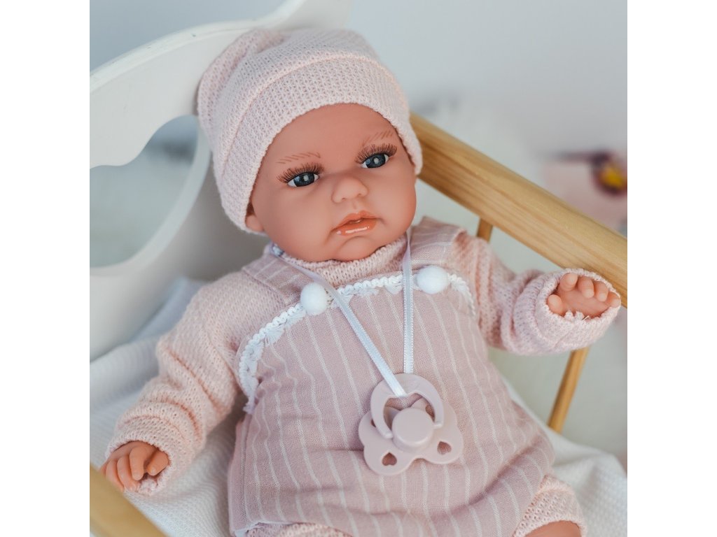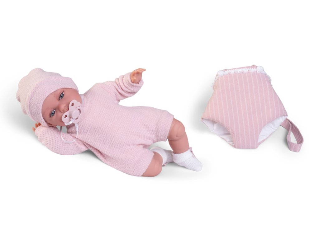 Španielska bábika 70357 vyrobená v Španielsku a je jemná na dotyk vďaka použitiu špeciálneho vinylovému materiálu. Nápadné sú vlásky na hlavičke a rafinované detaily vzhľadu bábätka: drobné nechty, detské záhyby a odtlačky prstov. Perfektné na maznanie, oblečená v teplom overale s dlhým rukávom a zapínaním na suchý zips, v rozkošných bielych ponožkách zdobených saténovou mašľou a čiapočkou, nabáda k prezliekaniu a vžitiu sa do role starostlivej mamičky.