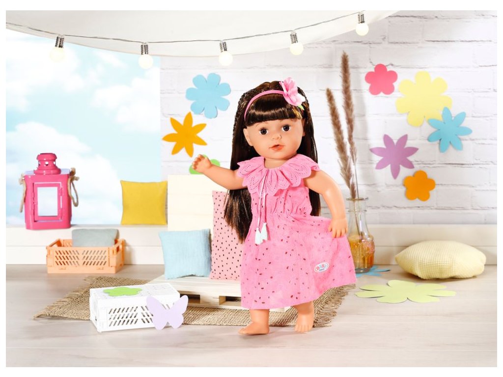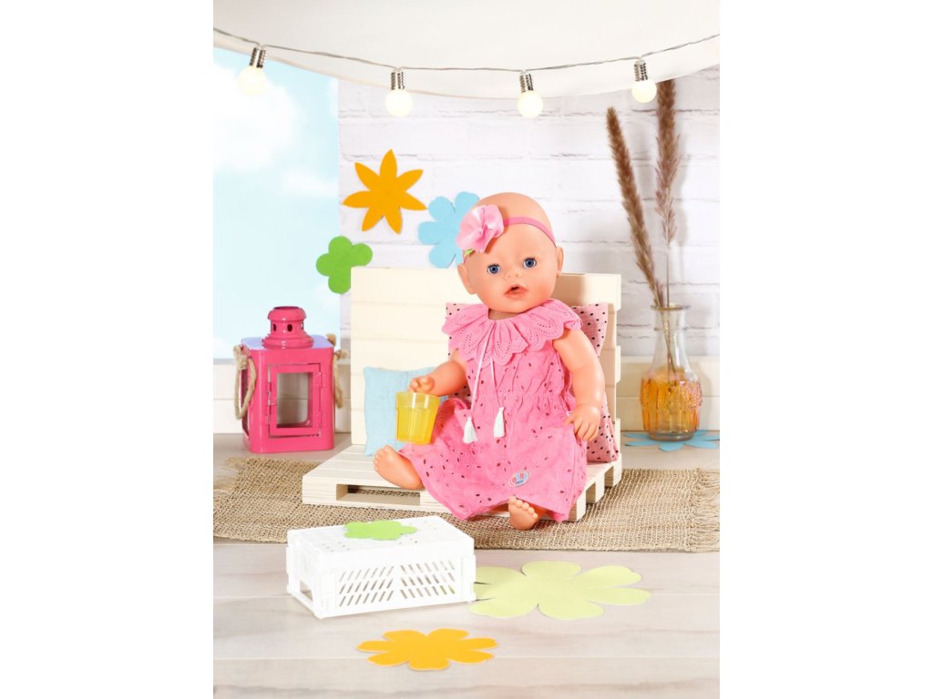 Štýlové kvetinové deti si tento outfit zamilujú. Šaty z ružovej krajkovej látky majú starostlivo prepracovaný naberaný golier. Visia z neho ružové šnúrky s hravými strapcami na konci. Nevyhnutným doplnkom k romantickým šatôčkam je čelenka do vlasov s veľkým ružovým kvetom. • Kvalitné oblečenie pre originálnu bábiku BABY born. • Pre radosť z nápaditej, rozmanitej a dlhotrvajúcej hry. BABY born Kvetinové šatôčky pre bábiky veľkosti 43 cm. Súčasťou sú šatôčky a čelenka a vešiačik.Dodatočné parametre