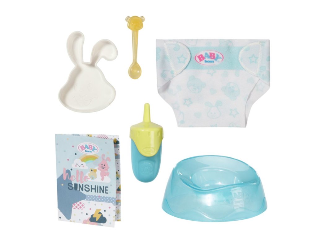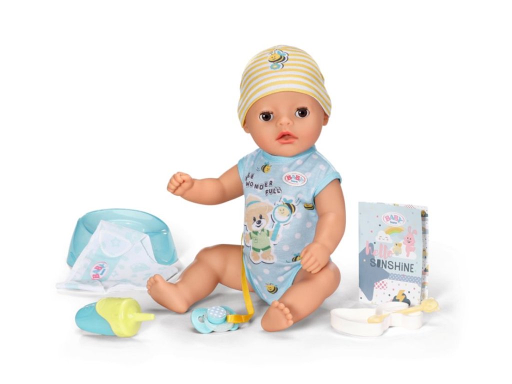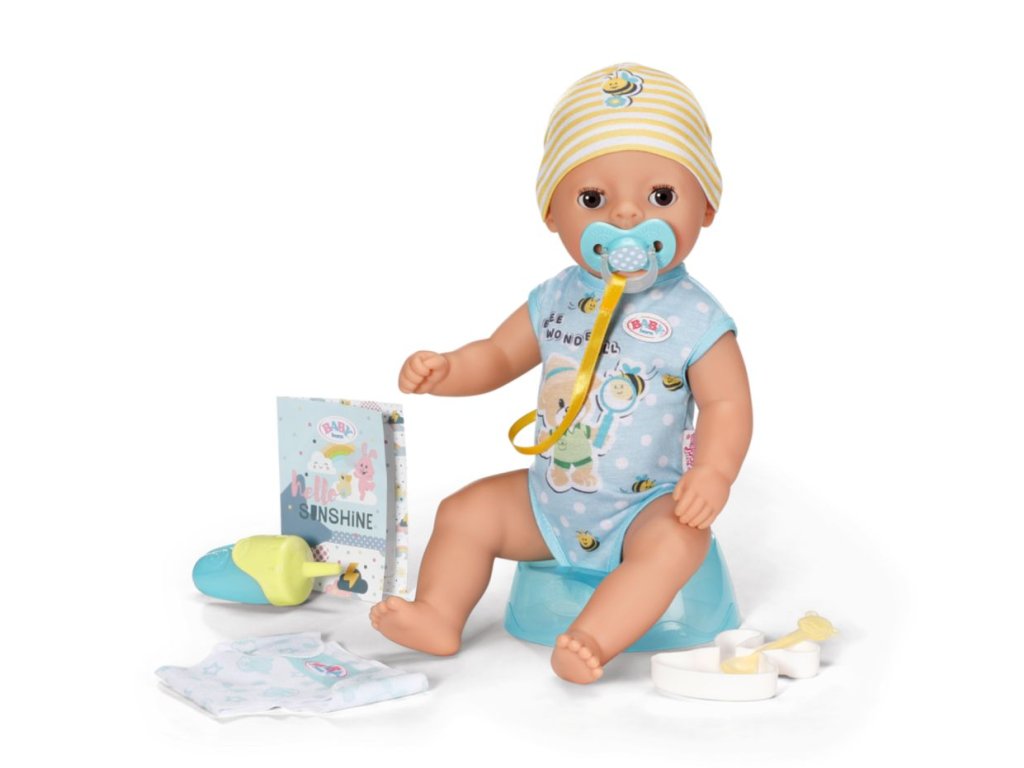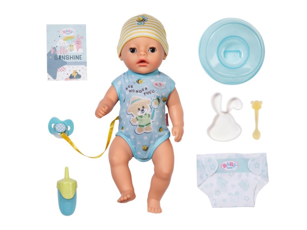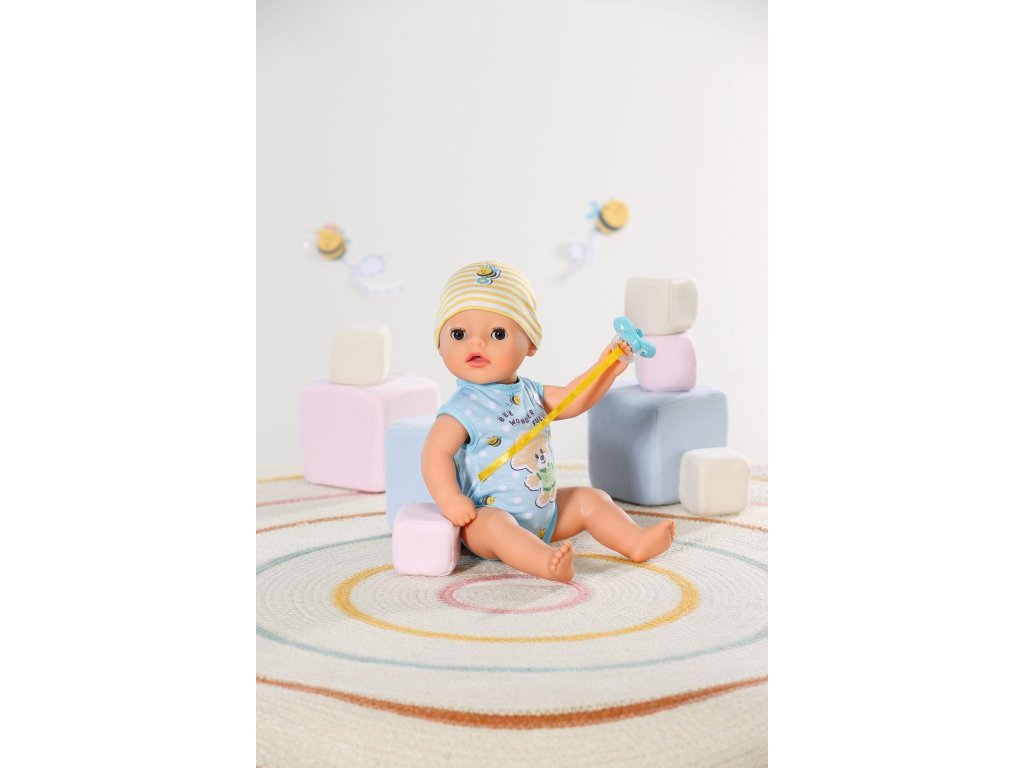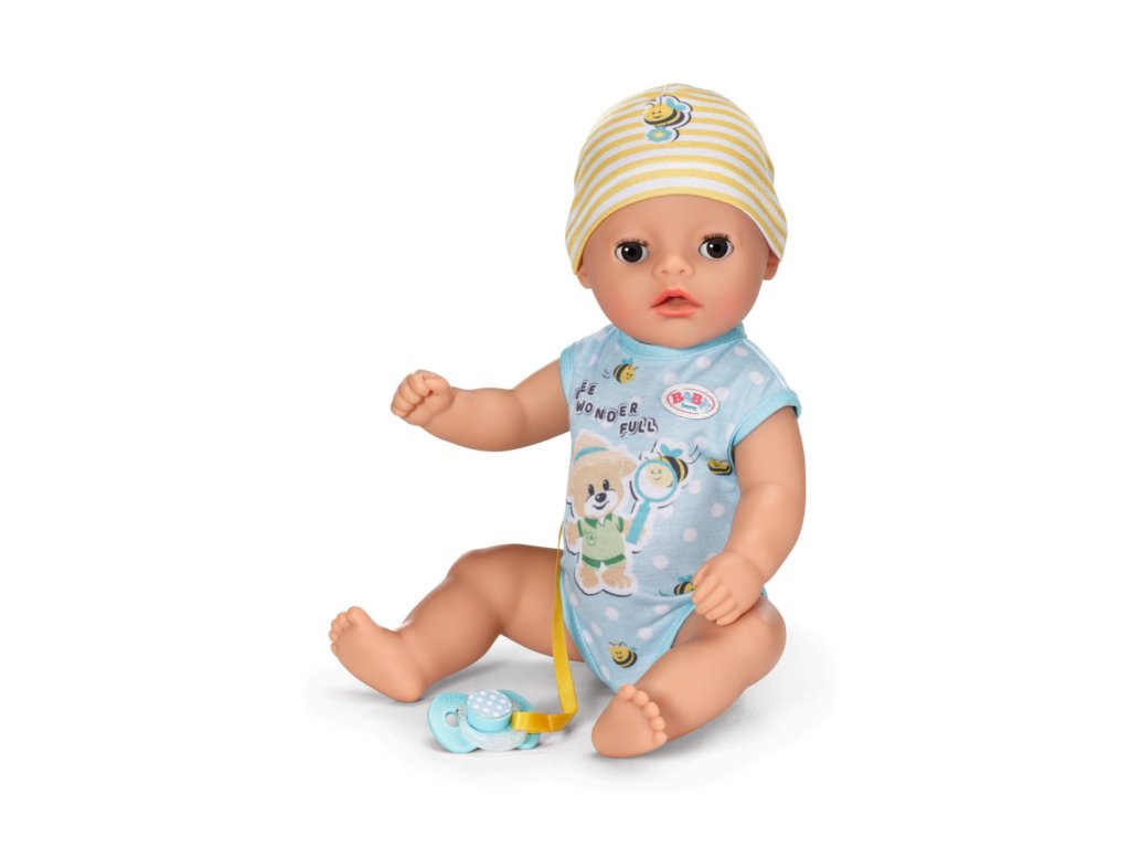 BABY born Little, chlapček, má 7 skvelých funkcií, ktoré fungujú bez batérií. Je dodávaný so všetkým, čo potrebuje. Môže piť vodu z fľaštičky, nechať sa prebaľovať alebo chodiť na modrý nočník. Keď dostane cumlík, ktorý je stužkou pripevnený k dupačkám, kúzelne sa mu otvoria alebo zavrú oči. Pokiaľ cumlíkom otočíte doľava, zavrie oči, pokiaľ ním otočíte doprava, oči otvorí. Pokiaľ ho uložíte k spánku do jeho postieľky, zavrie oči aj bez cumlíka. Má pohyblivé ruky, nohy a hlavu a prezliekanie oblečkov je tak zábavnou detskou hrou. Vďaka veľkosti 36 cm je vhodný pre malé ručičky detí od jedného roka a je ideálnou bábikou pre začiatky hrania sa s bábikou - bábätkom. Môžu spolu so svojou malou mamičkou dokonca sedieť každý na svojom nočníku a BABY born deťom pomôže pri učení sa na nočník.Dodatočné parametre