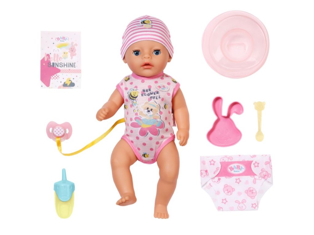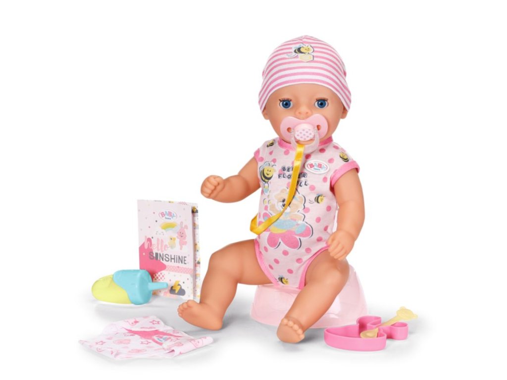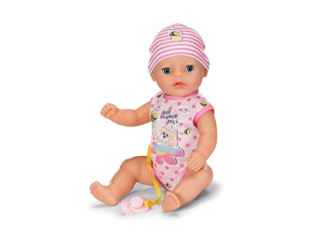 BABY born Little, dievčatko, má 7 skvelých funkcií, ktoré fungujú bez batérií. Je dodávaná so všetkým, čo potrebuje. Môže piť vodu z fľaštičky, nechať sa prebaľovať alebo chodiť na ružový nočník. Keď dostane cumlík, ktorý je stužkou pripevnený k dupačkám, kúzelne sa jej otvoria alebo zavrú oči. Pokiaľ cumlíkom otočíte doľava, zavrie oči, pokiaľ ním otočíte doprava, oči otvorí. Pokiaľ ju uložíte k spánku do jej postieľky, zavrie oči aj bez cumlíka. Má pohyblivé ruky, nohy a hlavu a prezliekanie oblečkov je tak zábavnou detskou hrou. Vďaka veľkosti 36 cm je vhodná pre malé ručičky detí od jedného roka a je ideálnou bábikou pre začiatky hrania sa s bábikou - bábätkom. Môžu spolu so svojou malou mamičkou dokonca sedieť každá na svojom nočníku a BABY born deťom pomôže pri učení sa na nočník.Dodatočné parametre