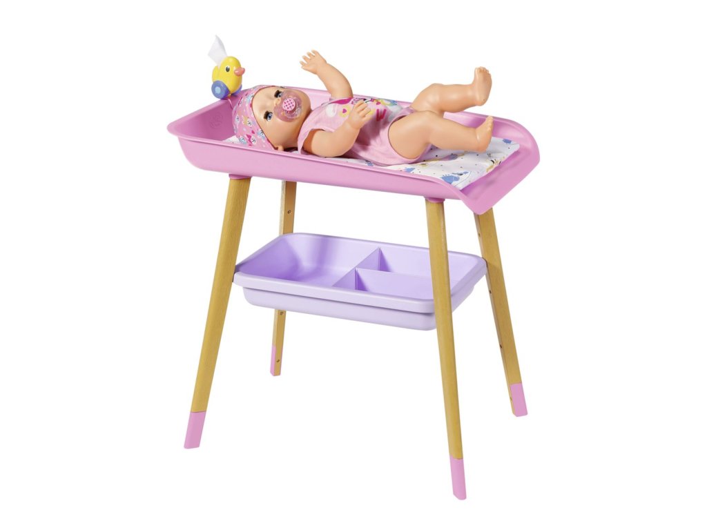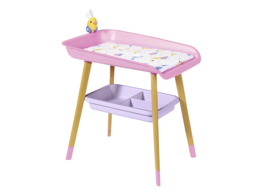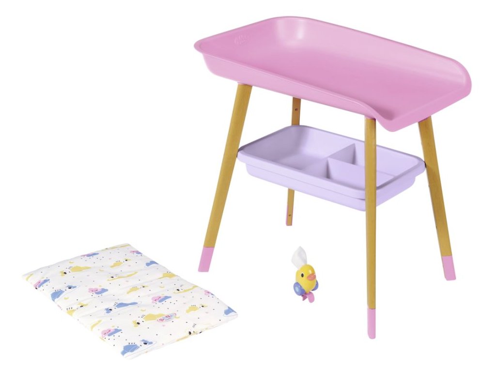 Zle prebalené? To sa s prebaľovacím stolom BABY born nemôže stať. Stôl v škandinávskom štýle má nohy vo vzhľade dreva a skvele sa hodí do detskej izbičky k Jedálenskej stoličke a Stojanom na oblečenie. Kým bábika BABY born leží na mäkkej prebaľovacej podložke, kačička Berta sleduje prebaľovanie a okrem toho, že BABY born utešuje, tiež ponúka obrúsky. V trojdielnej priehradke pod prebaľovacou podložkou je možné uložiť čisté plienky, oblečenie alebo hračky. • Kvalitný doplnok pre originálnu bábiku BABY born. • Pre radosť z nápaditej, rozmanitej a dlhotrvajúcej hry. • Vhodný aj pre menšie bábiky. BABY born Prebaľovací stôl s odnímateľným zásobníkom obrúskov.Dodatočné parametre