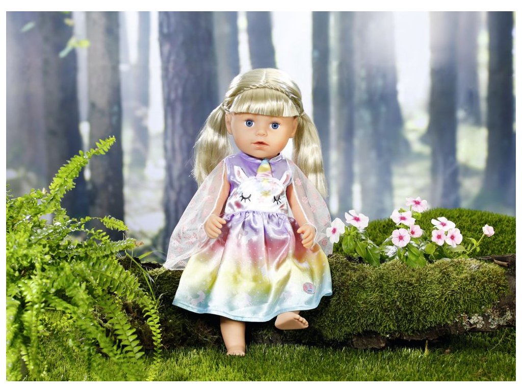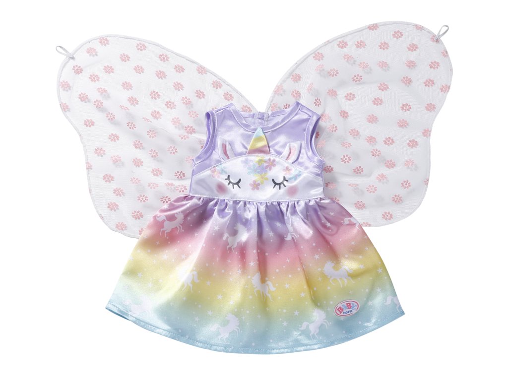 Víly a jednorožce k sebe patria rovnako ako mlieko a sušienky. Vílie šatôčky pre bábiku BABY born sú ušité z nádhernej dúhovej látky. Sukienka je potlačená kúzelnými jednorožcami tancujúcimi po hviezdnej oblohe. Horná časť šiat je vpredu ozdobená tvárou jednorožca s našitými uškami a farebným rohom. Správna víla musí mať samozrejme aj krídelká. Priehľadné krídelká s trblietavými kvietkami sú všité do zadnej časti šiat a akonáhle BABY born prestrčí ruku malým očkom v hornej časti krídielok, otvoria sa. • Originálne oblečenie pre bábiky BABY born. • Pre nápaditú, rozmanitú a dlhotrvajúcu hru. BABY born Rozprávkový kostým "Jednorožec" pre bábiky vo veľkosti 43 cm. Súčasťou je vešiačik.Dodatočné parametre