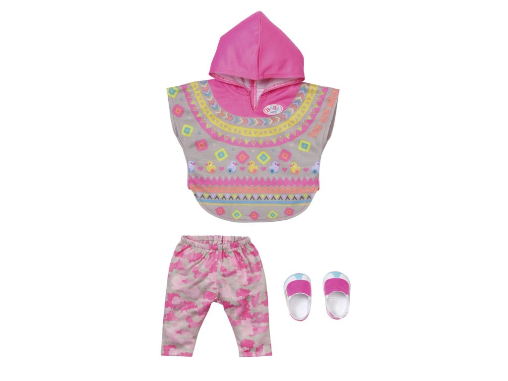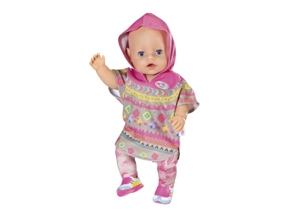 Toto pončo je trendy a pohodlné. Je ozdobené potlačami kačičky Berty a veľmi aktuálnych etno vzorov. Ponúka dostatočnú voľnosť pohybu a je rýchlo oblečené. Model to síce nie je práve nenápadný, ale aj tak sa k nemu skvele hodia nohavice s maskovacím vzorom v tmavo ružovej, svetlo ružovej a šedej farbe. Tomuto maskovaciemu vzoru sa hovorí kamufláž. Model dopĺňajú krásne tenisky. • Kvalitné oblečenie pre originálnu bábiku BABY born. • Pre radosť z nápaditej, rozmanitej a dlhotrvajúcej hry. • Veľmi jednoduché prezliekanie. BABY born Súprava s pončom Deluxe pre bábiky veľkosti 43 cm. Súčasťou je pončo, nohavice a topánky.Dodatočné parametre