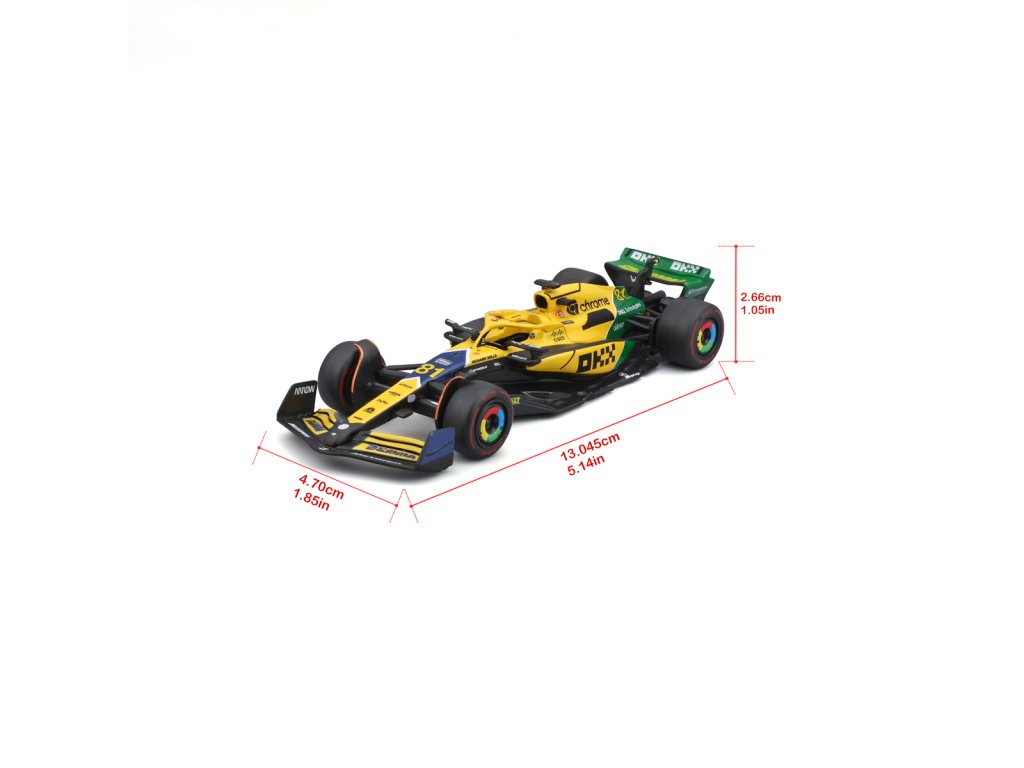 Bburago modely závodních vozů Formule 1 v měřítku 1:43 z kolekce RACE jsou sbírkou krásného designu s vysokým důrazem na přesnost detailů. Modely F1 ze stáje McLaren MCL38 (2024) ve speciální Senna Edition jsou vyrobeny z litého kovu s plastovými detaily. Každý z modelů je v klasickém závodním designu a se závodním číslem. Baleno v krabičce. Nevhodné pro děti do 3 let. Rozměry balení: 6,7 x 14,7 x 7,5 cm. Věk: 3+Dodatočné parametre