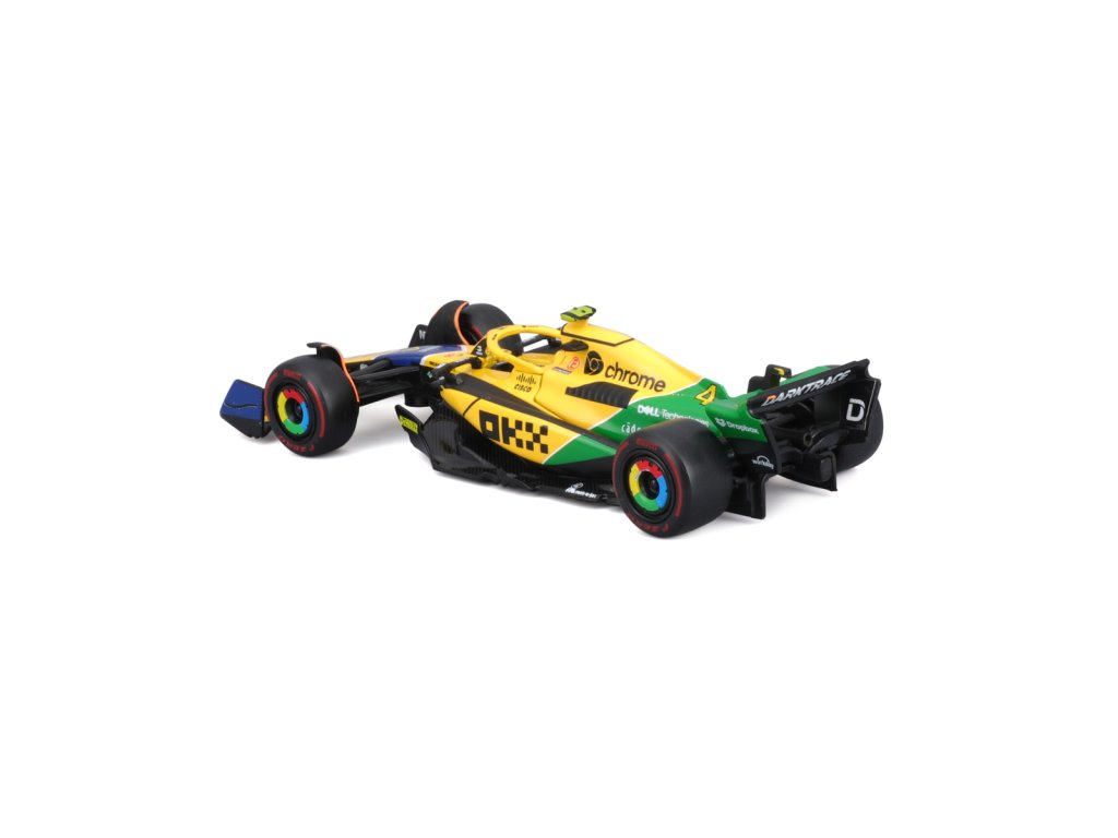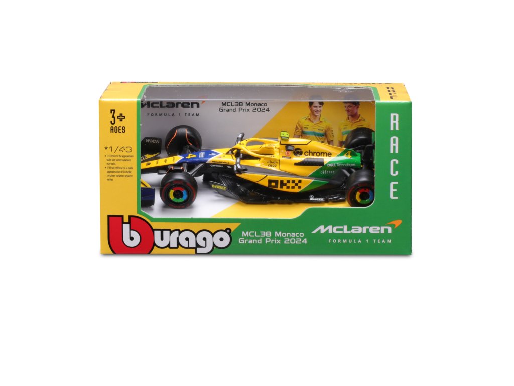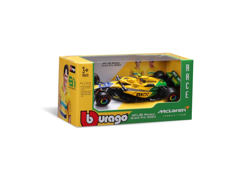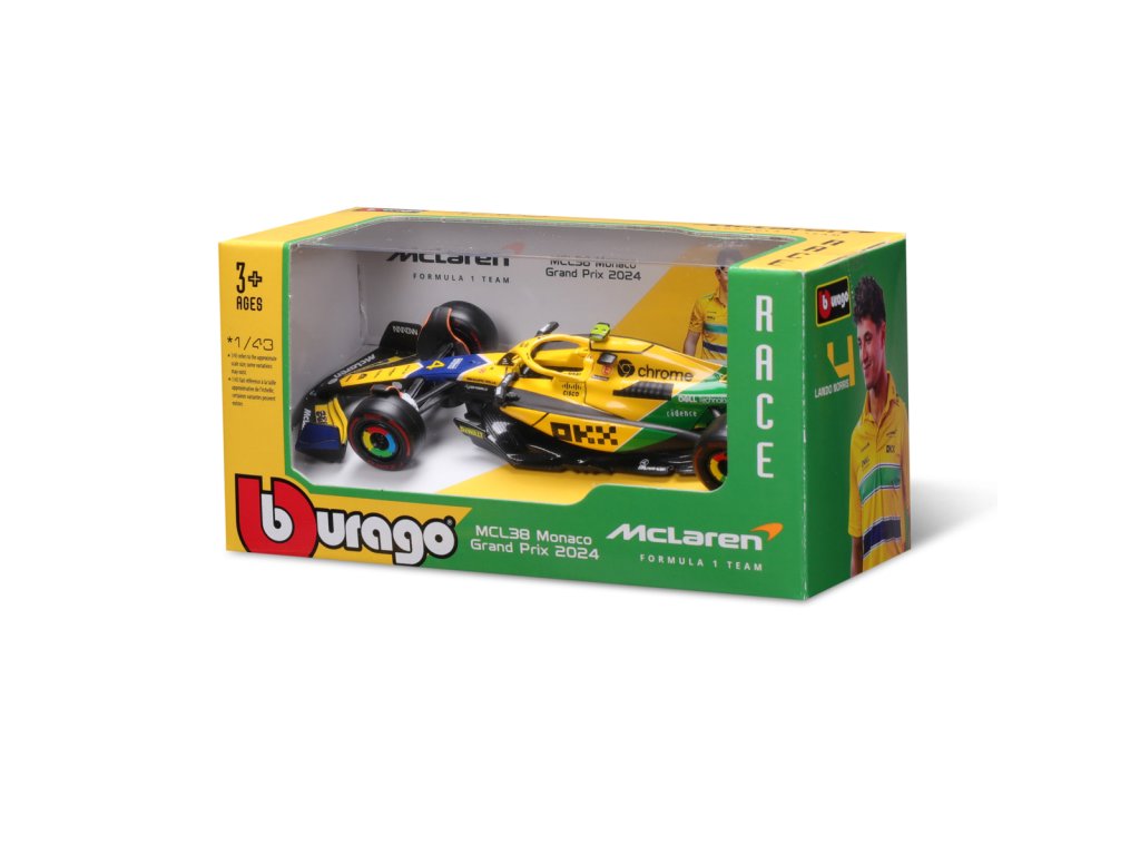 Bburago modely závodních vozů Formule 1 v měřítku 1:43 z kolekce RACE jsou sbírkou krásného designu s vysokým důrazem na přesnost detailů. Modely F1 ze stáje McLaren MCL38 (2024) ve speciální Senna Edition jsou vyrobeny z litého kovu s plastovými detaily. Každý z modelů je v klasickém závodním designu a se závodním číslem. Baleno v krabičce. Nevhodné pro děti do 3 let. Rozměry balení: 6,7 x 14,7 x 7,5 cm. Věk: 3+Dodatočné parametre