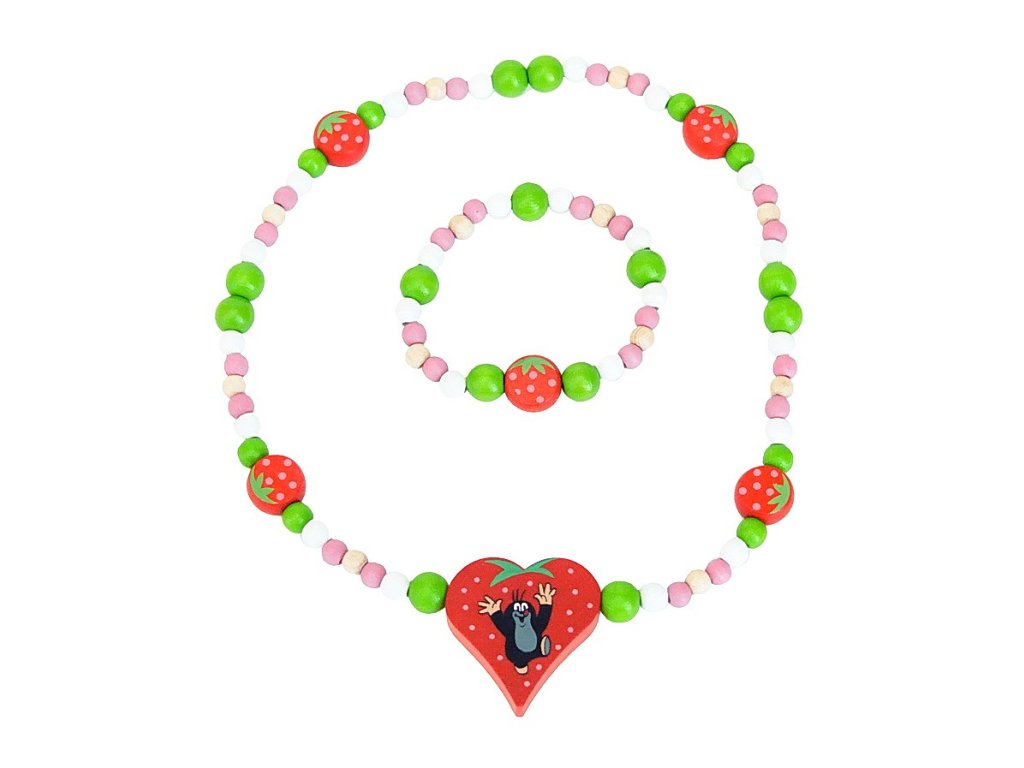 Drevená bižutéria s krtkom a jahôdkami. Navlečené na jemnej gumičke. Nevhodné pre deti do 3 rokov. Obsahuje malé časti. Výrobok je zdravotne neškodný.Dodatočné parametre