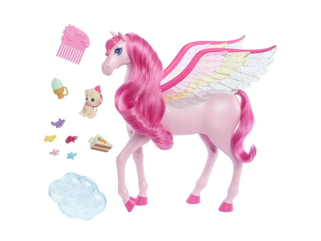 Nechajte fantáziu stúpať na krídlach tohto ružového pegasa Barbie®! Deti si môžu zahrať svoje obľúbené scény z filmu Barbie a dotyk kúzla alebo si vymýšľať vlastné fantastické dobrodružstvá. Kúzelný Pegas prichádza s 10 rôznymi doplnkami, a pýši sa svetlami a zvukmi! Stlačte náhrdelník pegase alebo pohnite krídlami, a spustia sa dúhové svetlá a magické zvuky vrátane hudby z filmu. Pegas Barbie® má ružovú hrivu a chvost a tiež trblietavé dúhové krídla! Medzi doplnky patrí kúzelné šteniatko, sladké maškrty, hrebeň a ďalšie roztomilé doplnky. Farby a vzhľad výrobku sa môžu líšiť.Dodatočné parametre
