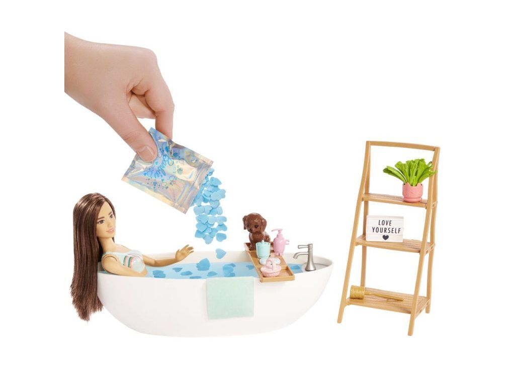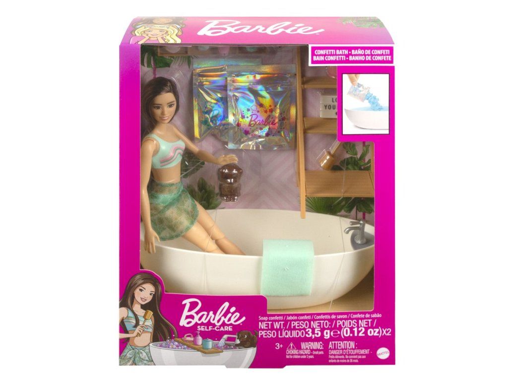 Tento herný set Barbie® Bábika a kúpeľ s mydlovými konfetami s vaňou a bábikou Barbie® obsahuje Barbie® bábiku oblečenú do plaviek s roztomilým sarongom, ktorá je polohovateľná a dodáva sa s množstvom doplnkov, ako sú vaňa a podnos, uterák, kefy, šteniatko a ďalšie . Súčasťou balenia sú dva vrecká konfetového mydla (ružové a modré), ktoré zmenia farbu vody vo vani! Bábika nevie samostatne stáť.Dodatočné parametre