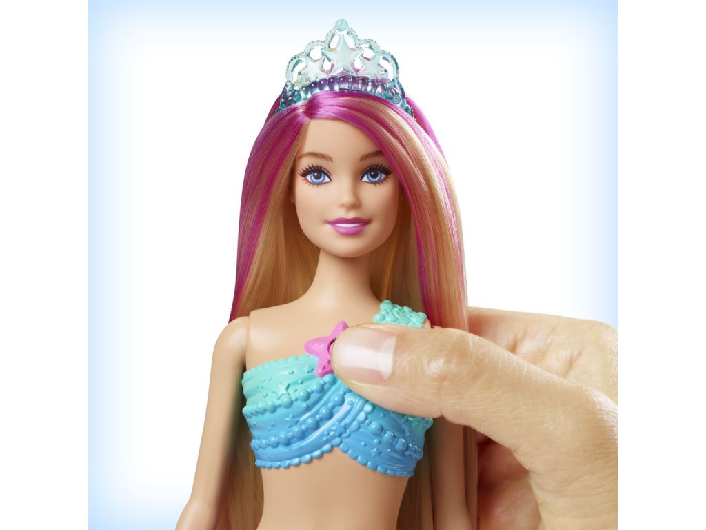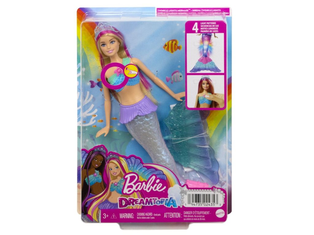 S bábikou Barbie™ Blikajúca morská panna blondínka™ sa môžete úplne ponoriť do rozprávania príbehov. Ponorte túto krásnu bábiku Barbie™ do vody a uvidíte, ako jej ligotajúci sa perleťový chvost svieti jednou zo štyroch farebných show. Užite si s bábikou Barbie™ špliechanie vo vani, v bazéne alebo nechajte deti preniesť zábavu i na breh - stlačením tlačidla v tvare hviezdy na živôtiku bábiky Barbie™ si užijú svetelnú show i bez vody. Dúhové plutvy, ružový melír a princeznovský diadém dopĺňajú farebný vzhľad Barbie™ ako morskej panny. Bábika Barbie™ Blikajúca morská panna je ideálna pre vodné hry (nutný dohľad rodičov) a je skvelým darčekom pre deti od 3 do 7 rokov. Bábika nevie samostatne stáť ani plávať.Dodatočné parametre
