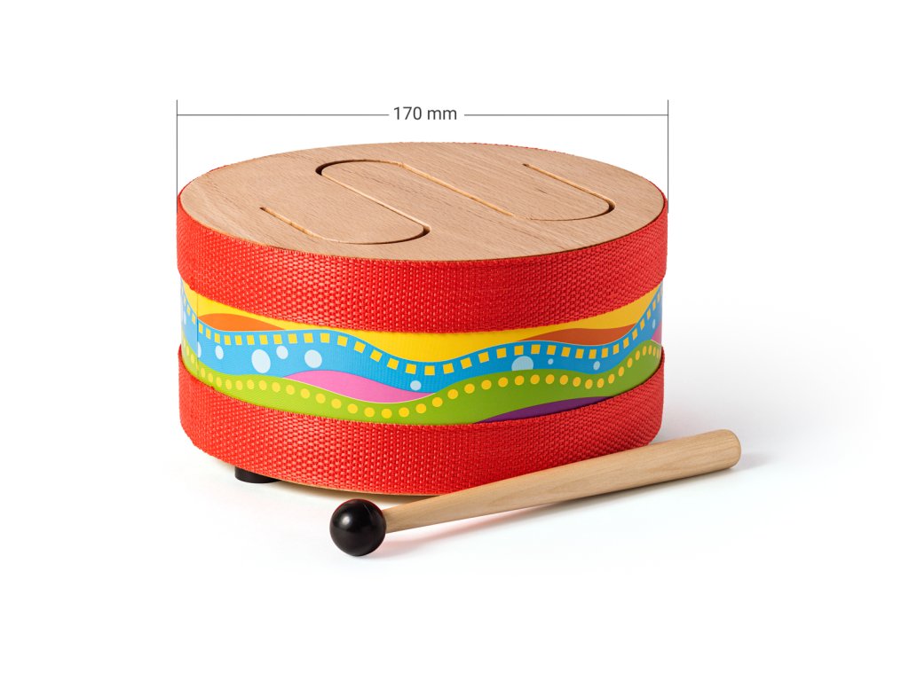 Bubnovacia plocha dreveného bubienka je špirálovým prierezom rozdelená na niekoľko častí. Každá z týchto častí má iný tón úderu. Tóny bubna sú ovplyvnené materiálom, z ktorého je bubon vyrobený a majú príjemne drevený podtón. Vizuálne spracovanie bubienka navodzuje hravú atmosféru plnú radosti a fantázie. Vek: 3+ | Priemer bubienka: 15 cm, výška: 9 cmDodatočné parametre
