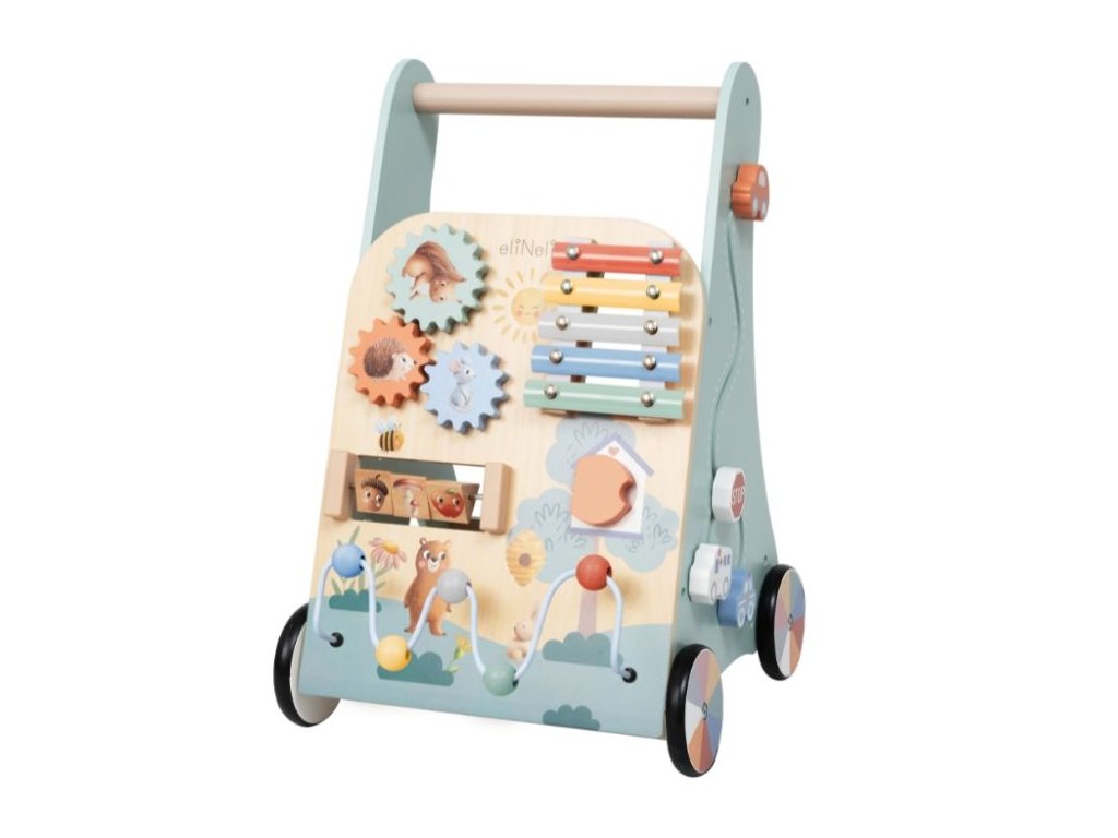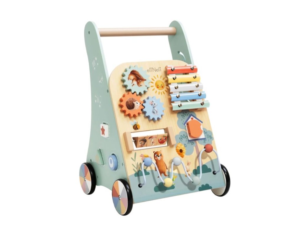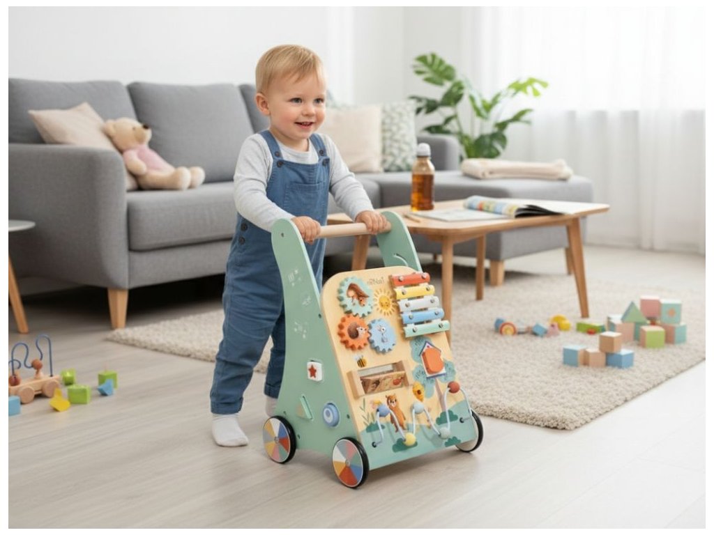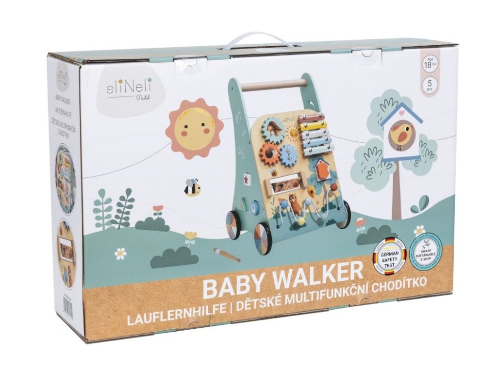 Multifunkčný dizajn pre rozvoj detí Detské chodítko kombinuje podporu samostatnej chôdze s bohatými hracími prvkami, ktoré pomáhajú deťom hrať sa, učiť sa a objavovať svet okolo seba. Obľúbené otočné kolieska, posuvné korálky, otváracie dvierka a vkladačky stimulujú koordináciu oko-ruka a rozvíjajú jemnú a hrubú motoriku. Predná časť chodítka obsahuje xylofón, ktorý deti zabáva a zároveň pomáha rozvíjať rytmus, hudobný sluch a kreativitu. Hra s chodítkom podporuje logické myslenie, trpezlivosť a sústredenie pri objavovaní nových činností. Prírodné materiály a bezpečnosť Chodítko je vyrobené z prírodného dreva a natreté netoxickými farbami na vodnej báze, takže je bezpečné aj pre najmenšie deti. Kolieska sú potiahnuté gumou, ktorá zabraňuje pošmyknutiu, chráni podlahu pred poškriabaním a tiež tlmí zvuk pri behu, vďaka čomu je chodítko ideálne na domáce použitie. Technické parametre Rozmery 32,5 × 32,8 × 47,5 cm Rozmery balenia 52,5 × 13,5 × 34 cm Hmotnosť 3,35 kg Hmotnosť balenia 3,82 kg Materiál Preglejka, bukové drevo, MDF, jalovcové drevo, kov Certifikáty EN 71-1,2,3, CE, 2009/48/ES Odporúčaný vek od 18 mesiacov Výhody výrobku Farebné motívy zvierat motivujú deti k objavovaniu a podporujú tvorivosť, koncentráciu a predstavivosť pri každodennej hre. Chodítko tiež pomáha deťom samostatne chodiť a rozvíja jemnú a hrubú motoriku. Integrované aktivity, ako je skladačka, autodráha a xylofón, stimulujú logické myslenie, koordináciu oko-ruka a učia deti trpezlivosti. Prírodné materiály a netoxické farby zabezpečujú bezpečnú hru, zatiaľ čo gumené kolieska chránia podlahu a tlmia zvuk pri jazde. Výhody výrobku Prírodné materiály Chodítko je vyrobené z prírodného dreva, ktoré zaručuje bezpečnosť a ekologickosť. Multifunkčný dizajn Kombinuje chodítko a zábavnú hračku s aktivitami, čím poskytuje všestrannú zábavu. Zábavné aktivity Obsahuje skladačku, autodráhu, korálkové bludisko a ďalšie. Vzdelávacia pomôcka Učí deti rozpoznávať zvieratá, počítať a hrať na hudobný nástroj. Bezpečnosť pre deti Vyrobené z netoxických materiálov a vybavené gumovými kolieskami na ochranu podlahy. Motorický rozvoj Podporuje rozvoj jemnej a hrubej motoriky prostredníctvom rôznych aktivít. My v ELIS DESIGN sme sami rodičia detí rôzneho veku a záleží nám na tom, s čím sa hrajú. Preto pre vaše deti vytvárame a vyberáme aj zmysluplné hračky vyrobené z kvalitných, najlepšie prírodných materiálov inšpirovaných Montessori metodikou, ktoré nielen zabávajú, ale aj rozvíjajú. Je chodítko vhodné na všetky poschodia? Áno, kolieska sú vybavené gumou, ktorá chráni podlahu pred poškriabaním. Z akého materiálu je chodítko vyrobené? Chodítko je vyrobené z preglejky, bukového a jalovcového dreva, MDF a kovu. Pre aký vek je chodítko určené? Chodítko je vhodné pre deti od 18 mesiacov. Viac o produktoch eliNeli https://www.elineli.eu/cz/