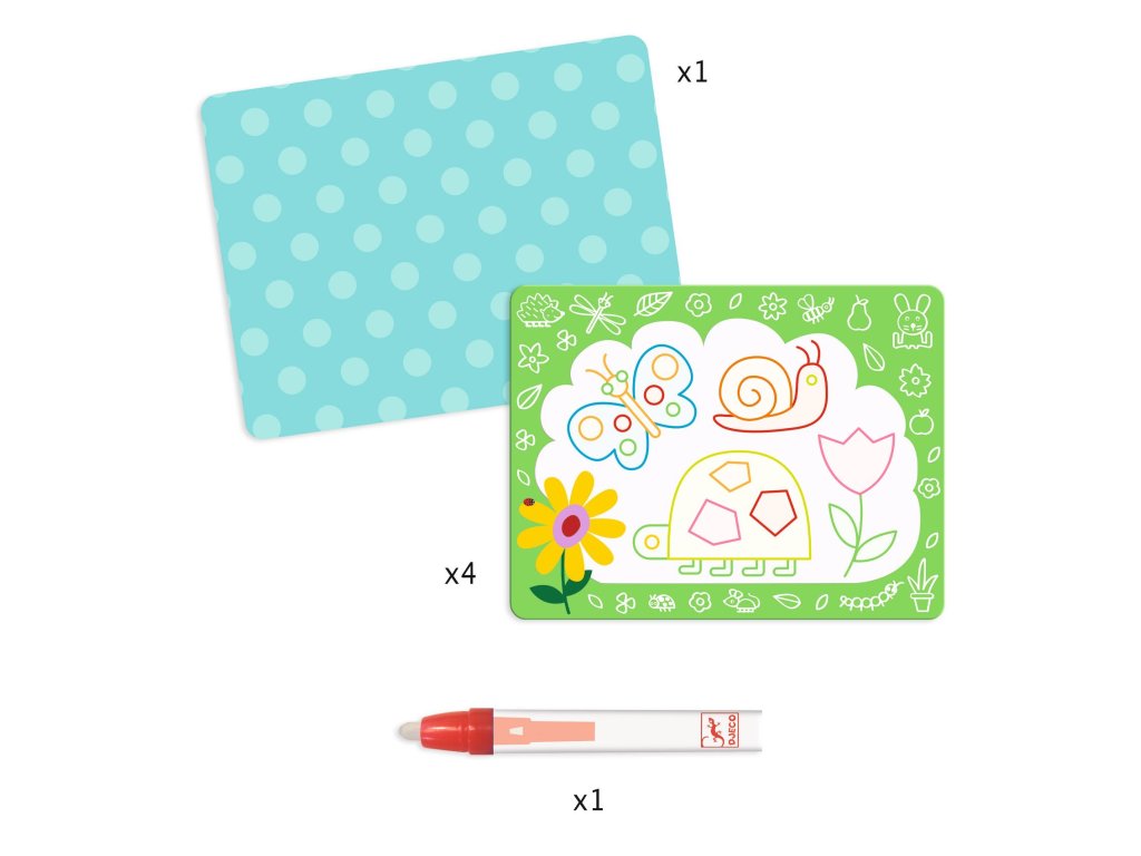 Čmáranice: magické vyfarbovanie vodouKúzelné maľovanie bez farieb a neporiadkuČmáranice – magické vyfarbovanie vodou je kreatívna sada pre najmenšie deti, ktorá umožňuje maľovať iba pomocou vody. Stačí naplniť priložený štetec s filcovým hrotom vodou a prejsť ním po obrázku – farby a motívy sa okamžite objavia ako kúzlom. Sada obsahuje 4 obrázky s čmáranicami a siluetami, ktoré sa po navlhčení vyfarbia a po uschnutí opäť zosvetlia. Deti tak môžu obrázky vyfarbovať opakovane, bez použitia farieb, fixiek či pasteliek. Ideálne riešenie na pokojné tvorenie doma aj na cestách.Výhody (Prečo si vybrať magické vyfarbovanie vodou od Djeco)maľovanie bez farieb a neporiadkuopakovane použiteľné obrázkyideálne pre malé detibezpečný a jednoduchý princípskvelé na doma aj na cestyvhodné pre deti od 18 mesiacovObsah balenia4 obrázky na magické vyfarbovanieštetec s filcovým hrotom a nádržkou na vodupodložka z hrubej lepenkyDodatočné parametre