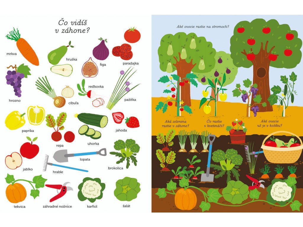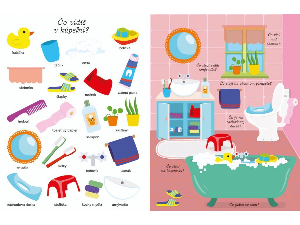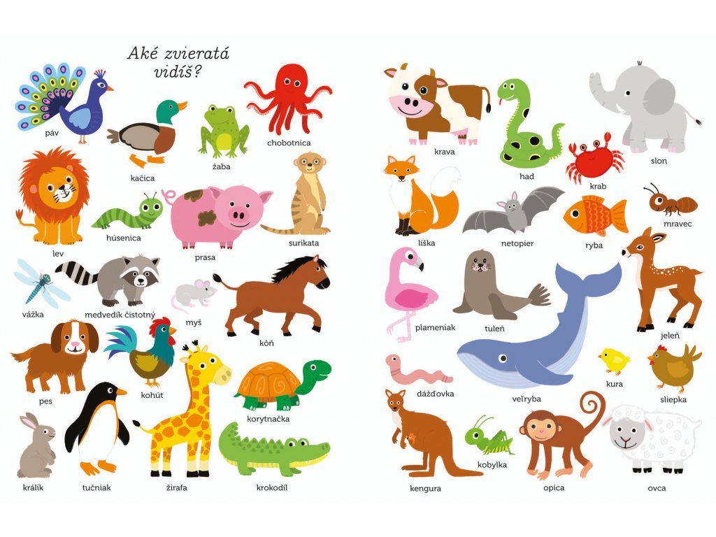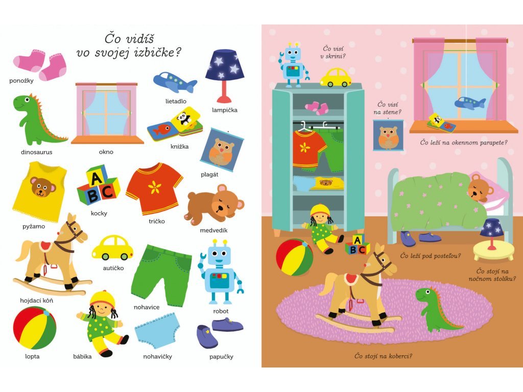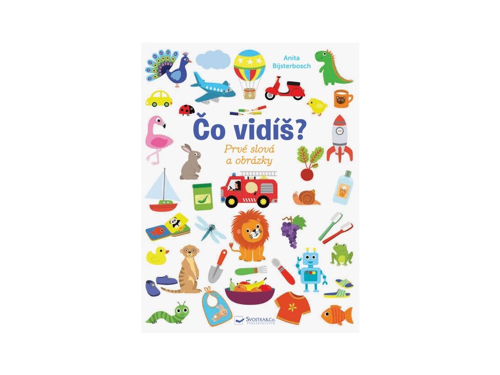 Čo vidíš? Prvé slová a obrázky Množstvo obrázkov a slovíčok na pomenovanie vecí, ktoré deti od 2 rokov najčastejšie vnímajú okolo seba. Čo dieťa okolo dvoch rokov vidí, čo vníma? A ako tomu hovorí? Správnemu rozvoju a osvojovaniu základnej slovnej zásoby môžete napomôcť s touto veľkou knihou plnou slovíčok a ilustrácií predmetov z bezprostredného okolia dieťaťa. Učenie slov je s touto knižkou pre najmenších zábavou. Čo vidíš v izbe, v kuchyni, v kúpeľni? A čo na záhrade? Ďalšie témy sú u detí taktiež veľmi obľúbené - zvieratá a dopravné prostriedky. Kniha obsahuje veľké stránky s jednoduchými výstižnými ilustráciami.Dodatočné parametre