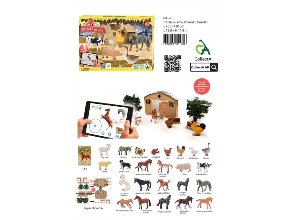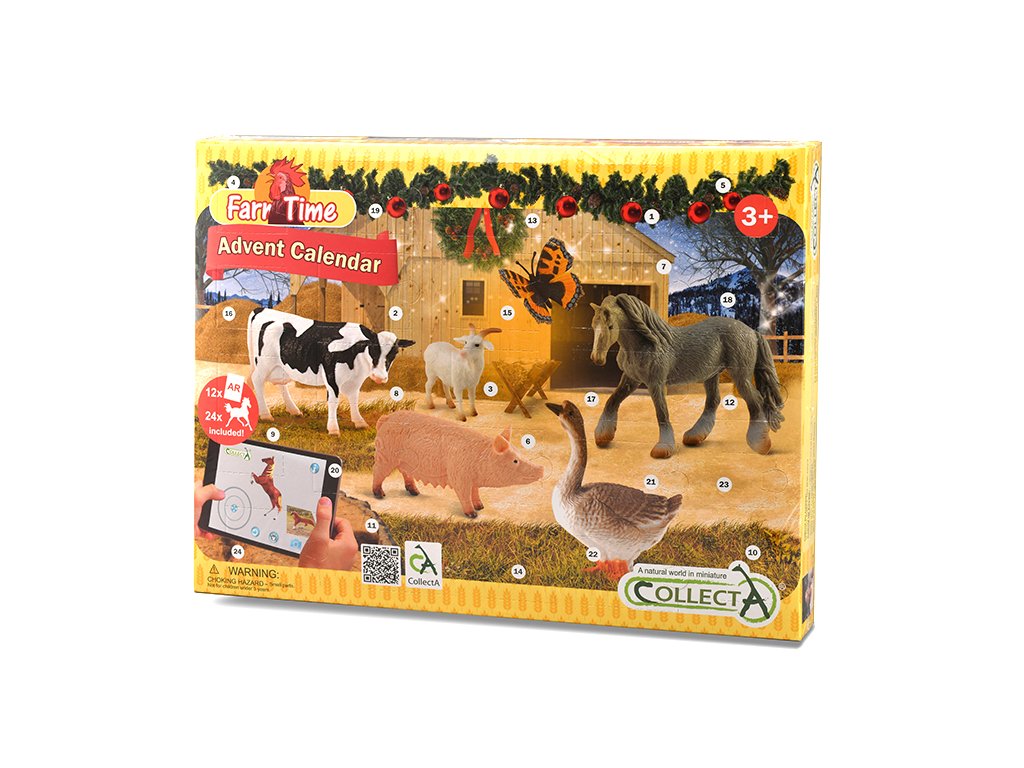Adventný kalendár spríjemní čakanie na Ježiška. Každý deň od 1. až do 24. decembra ti čakanie spríjemní jedna figúrka zvieratka z farmy. Adventný kalendár obsahuje 12 kartičiek, pomocou ktorých môžeš rozhýbať zvieratká z farmy. Ako na to? Stiahni si do svojho mobilného telefónu alebo tabletu aplikáciu CollectA AR. Otvor aplikáciu a namier telefón alebo tablet na kartičku zvieratka. Zvieratko sa ti začne hýbať. Pomocou šípok ovládaš jeho pohyb. Bude chodiť, kam budeš chcieť. Môžeš si ho aj pohladiť. Pomocou tlačidla „otvorená papuľa“ ovládaš zvukové efekty. Tlačidlo „i“ skrýva informácie o zvieratku v anglickom jazyku. Zvieratko si môžeš aj vyfotiť. Fotky sa uložia do galérie telefónu alebo tabletu.Dodatočné parametre