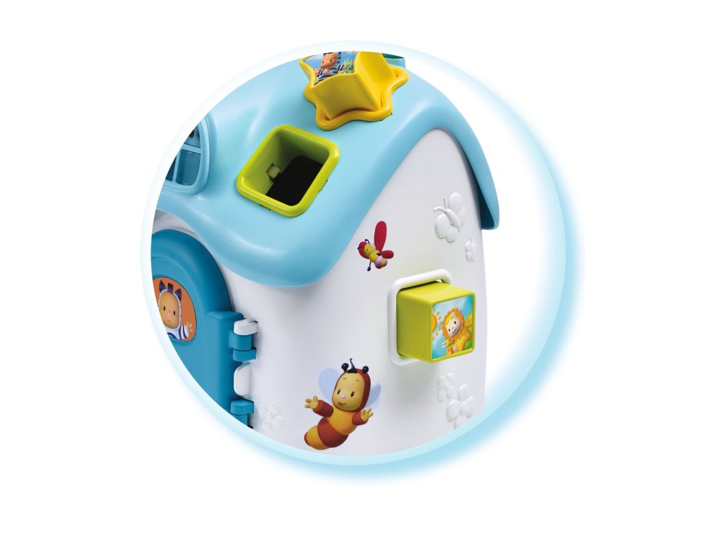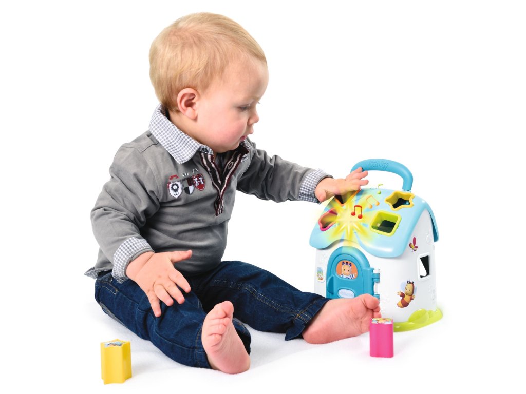 Obľúbený domček - vkladačka vo farebnom prevedení pre chlapčekov. Strecha domčeka so svetelným a zvukovým efektom. Pri vložení správneho tvaru do príslušného otvoru v streche, sa rozsvieti okno a začne hrať hudba alebo sa aktivuje zvuk.Součástí domčeku sú 4 farebné kocky. Každá má iný tvar. Pre ľahší prenos má domček na streche madlo.Dodatočné parametre