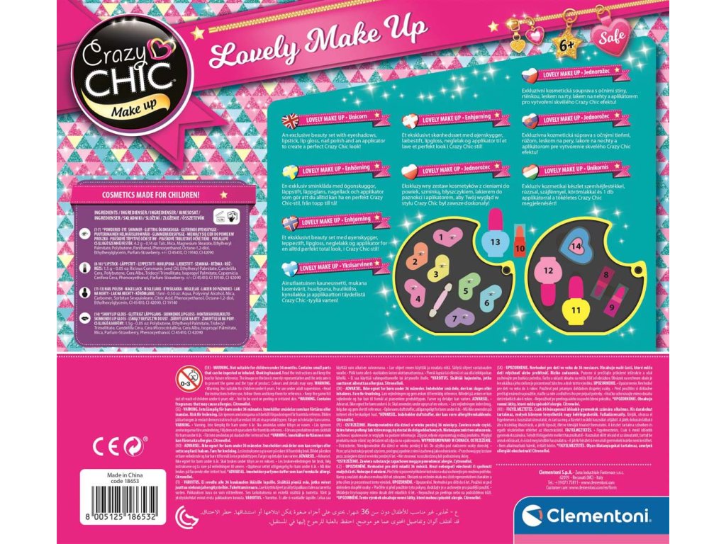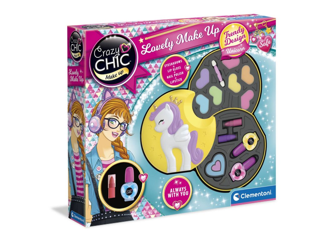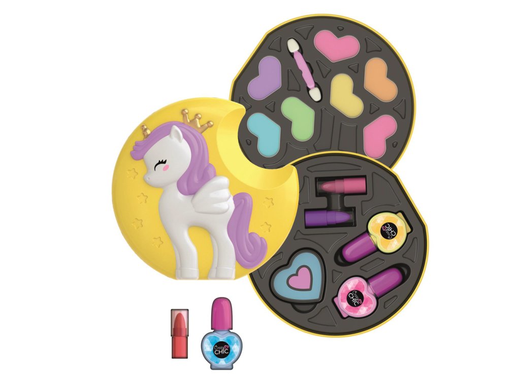 Exkluzivní dvoukazetová make - up sada Crazy CHIC ve tvaru jednorožce je super kompaktní, s paletou jemných odstínů pro přirozený a trendy vzhled. Paleta barev obsahuje 7 očních stínů, 3 rtěnky, aplikátor na oční stíny, 3 laky na nehty a lesk na rty ve tvaru srdíčka. Sada stimuluje kreativitu a manuální dovednost mladých dívek v oblasti krásy a kosmetiky. Rozměry balení: 30 x 34 x 6 cm. Věk: 6+Dodatočné parametre