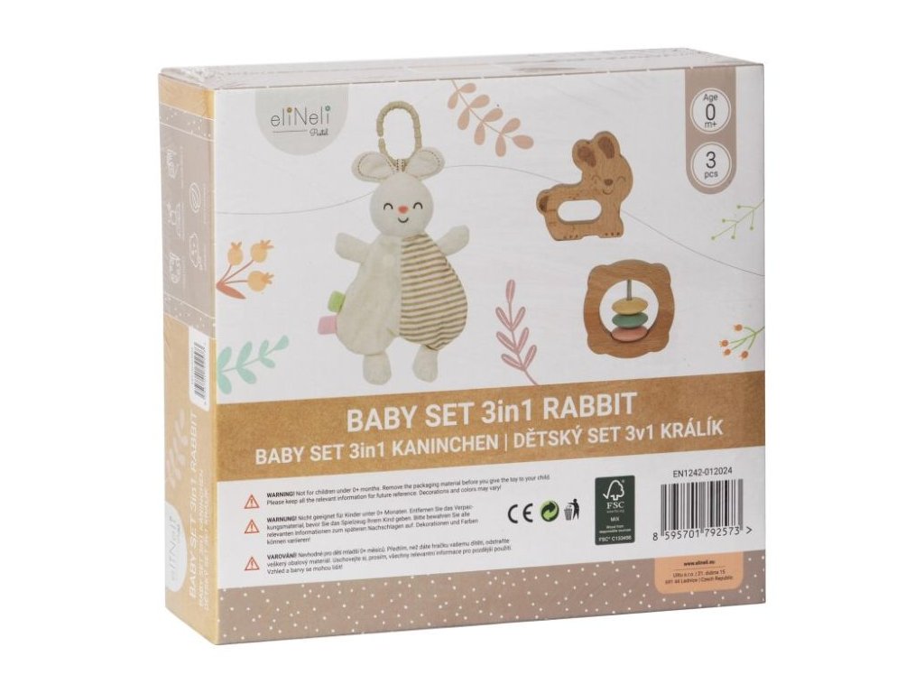 eliNeli je česká značka drevených hračiek a nábytku s jedinečným farebným dizajnom a so zahraničnou výrobou. Produkty eliNeli rozvíjajú kreativitu a pohybový potenciál detí, skvele zapadnú do interiéru a vracajú sa k tradičnému materiálu — k drevu. Unikátna na značke je dizajnová kombinácia prírodných a neskorých letných až jesenných farieb, ktoré sa hodia do minimalistického scandi interiéru, a ktoré inde nenájdete. To všetko za veľmi dostupné ceny. Darčeková sada (set) 3v1 pre deti od narodenia je krásnym darčekom pre bábätká. Sada obsahuje 3 hračky, vhodné pre najmenších, ktoré deti zabavia a zdokonalia ich schopnosti. Samozrejmosťou je roztomilý a hebký maznáčik (uspávačik) v podobe králička, ktorý pomôže deťom so zaspávaním v detskej postieľke, kolíske, kočíku aj v autosedačke, bude verným spoločníkom pri detských hrách a skúmaní sveta okolo seba. Drevená hrkálka svojimi zvukmi vykúzli úsmev na tváričke bábätka, stimuluje zmysly a rozvíja zvukové vnímanie. Súčasťou setu je aj drevená hračka v podobe králička, ktorá pohodlne padne do detskej rúčky, je tvarovaná na jednoduchý úchop aj manipuláciu. Prečo kúpiť tento darčekový set: Sada hračiek 3v1 - darčekový set pre deti od narodenia obsahuje roztomilého maznáčika, hrkálku aj drevenú hračku. Pre najmenších - set hračiek je vhodný pre bábätká už od narodenia. Roztomilý motív - motív králička (zajačika) je u detí jedným z najobľúbenejších motívov. Roztomilého králička predstavuje nielen uspávačik, ale aj drevená hračka. Maznáčik (uspávačik) - hebučký maznáčik (uspávačik) v podobe králička pomôže bábätku so zaspávaním v postieľke, v kočíku aj v autosedačke. Hrkálka - drevená hrkálka stimuluje zmysly a vykúzli úsmev na tvári bábätka. Drevená hračka - drevená hračka v podobe králička je svojim tvarom prispôsobená tým najmenším. Umožňuje jednoduchý úchop aj manipuláciu. Neutrálne farby - vďaka neutrálnym farbám je darčekový set vhodný pre dievčatká aj chlapcov. Rozvoj schopností - pri hre s drevenými hračkami a maznáčikom bábätko zdokonaľuje jemnú motoriku, stimuluje zmysly, trénuje úchop, koordináciu očí a rúk. Krásny darček - darčekový set je krásnym darčekom k príležitosti narodenia bábätka. Svojim motívom aj farbami je vhodný pre dievčatká aj chlapcov. Technické parametre: Rozmer: 28 x 25,5 x 6,5 cm. Materiál: bukové drevo, polyester. Certifikáty: CE, 2009/48/ES, EN 71-1, EN 71-2 a EN 71-3. Odporúčaný vek: od narodenia, 0+. Viac o produktoch eliNeli nájdete na: https://www.elineli.eu/sk/. Často kladené otázky: Je hračka bezpečná pre deti? Darčekový set Králiček eliNeli je testovaný, vhodný a bezpečný pre deti a vydrží vašim deťom dlho. Spĺňa požiadavky smernice o bezpečnosti hračiek 2009/48/ES a normy o nezávadnosti a bezpečnosti hračiek EN 71-1, 2, 3, kedy sa testujú mechanické a fyzikálne vlastnosti, horľavosť aj migrácia určitých látok. Darčekovú sadu otestoval a Certifikát o zhode (Osvedčenie o zhode - CE) udelil technický a skúšobný ústav. U darčekového setu pre bábätko eliNeli máte istotu, že je hračka pre vaše deti vhodná a bezpečná, je testovaná.Dodatočné parametre