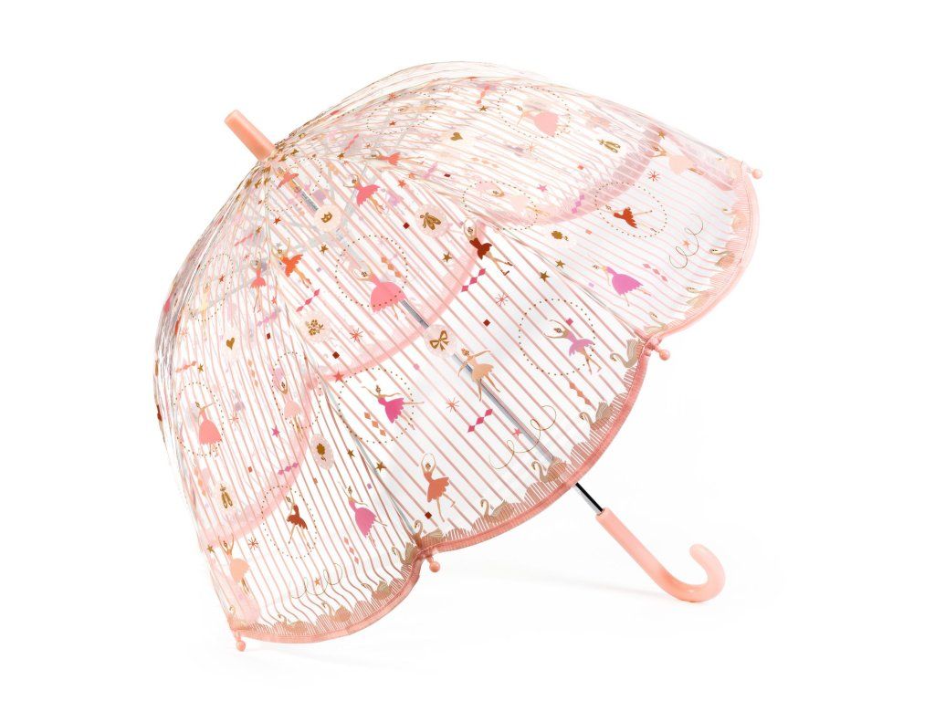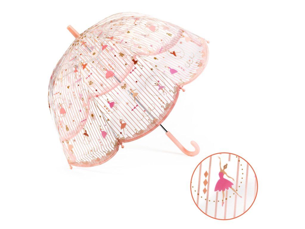Dáždnik Balerína Jemný baletný motív do dažďa: priehľadný dáždnik, ktorý dieťaťu nebráni vo výhľadeDáždnik Balerína je krásny detský dáždnik s elegantnými ilustráciami baletiek, ktorý spríjemní každú daždivú prechádzku.Vďaka priehľadnej kupole dieťa dobre vidí pred seba, cíti sa istejšie a ľahšie sa orientuje v priestore. Dáždnik má manuálne otváranie s ochranným systémom, ktorý pomáha predchádzať privretiu prstov, a odolnú konštrukciu zo sklolaminátu – je pružná a zároveň pevná.Obsah balenia 1× priehľadný detský dáždnik s motívom balerínRýchly prehľad odporúčaný vek: od 3 rokov veľkosť: približne 68 × 70 cm (priemer cca 70 cm) konštrukcia: 8 rebier zo sklolaminátu (flexibilné a odolné) otváranie: manuálne, s ochranou proti privretiu prstov rukoväť: matná plastová povrch: priehľadný plast + textilná úprava/lem